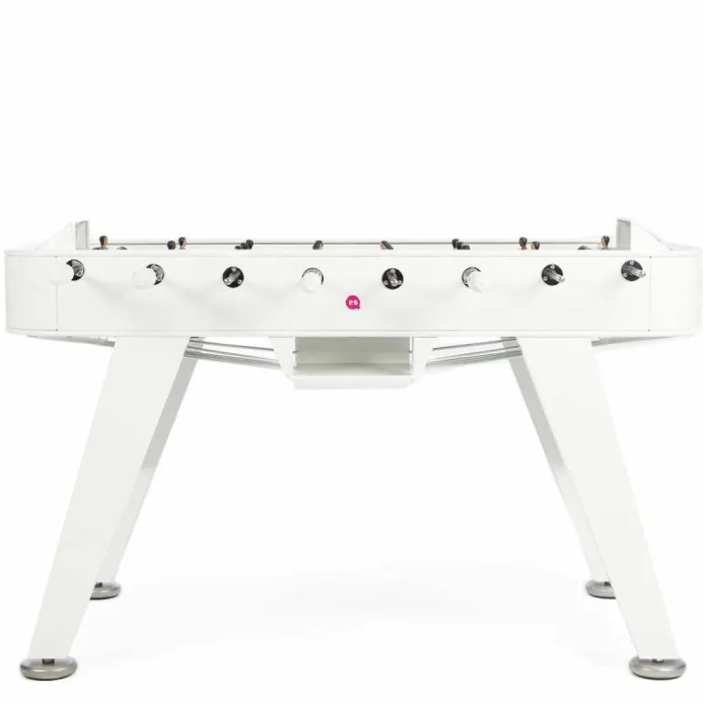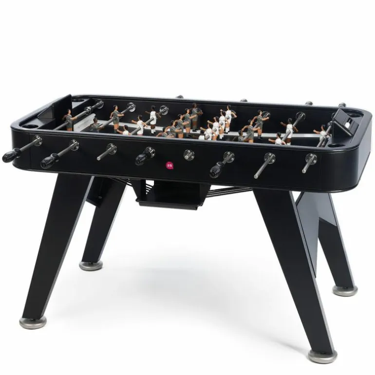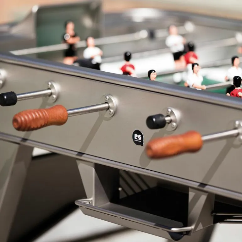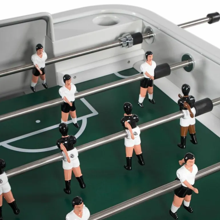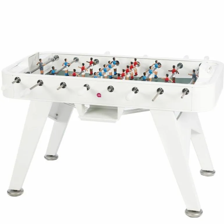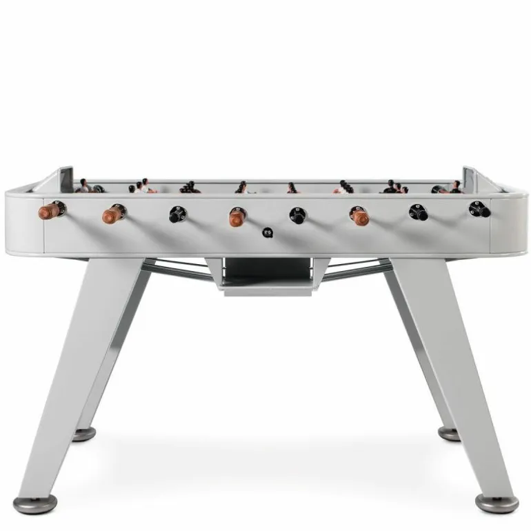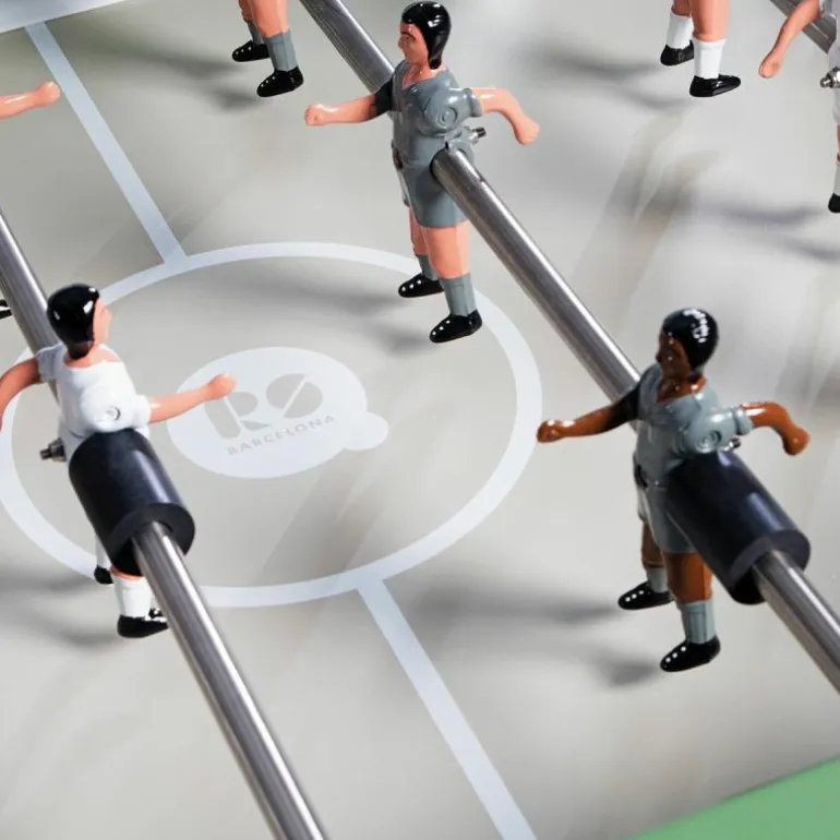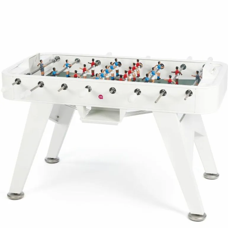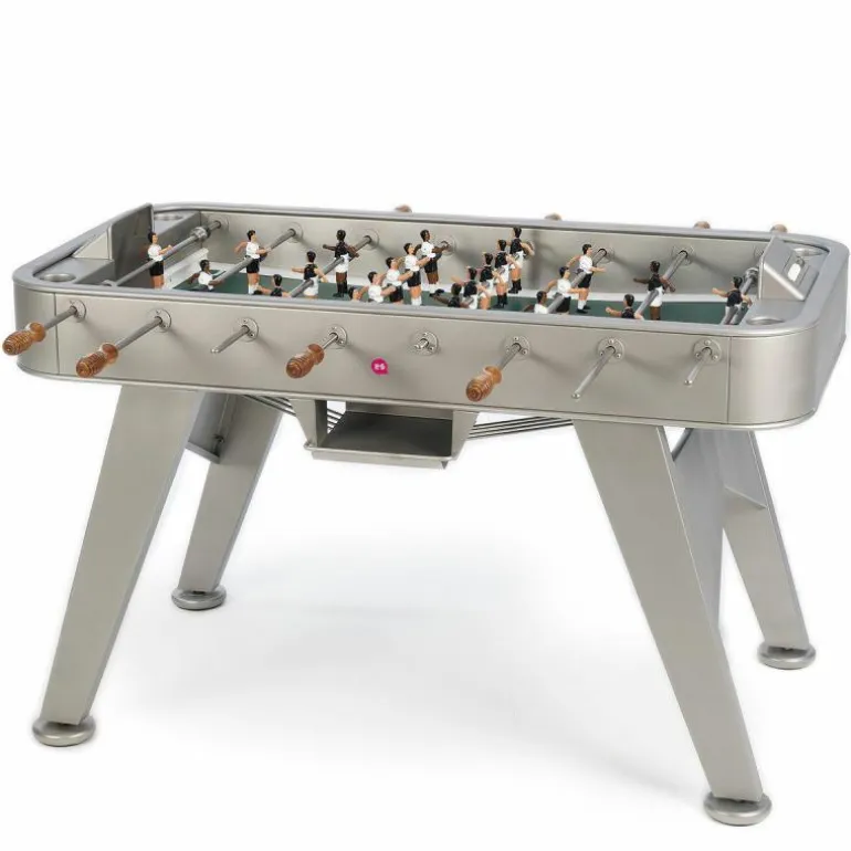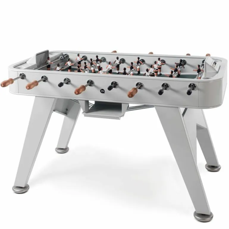 Deze tijdloze voetbaltafel past dankzij zijn tijdloze uitstraling in iedere setting en ruimte, van partijen binnenshuis tot een wedstrijd in het zonnetje buiten. Dankzij de ingebouwde bekerhouders die elk aan een uiteinde van de tafel ingebouwd zijn kunt u tijdens het potje ook genieten van een verfrissende dorstlesser. De tafel wordt geleverd met standaard teams, maar kan helemaal naar eigen wens worden aangepast met exclusieve team-kits. De RS2 is vervaardigd van sterk metaal in verschillende elegante kleuren, en is verkrijgbaar in een indoor variant en een in-/outdoor variant. Het tafelblad is gemaakt van hoge druk laminaat en vormt de ondergrond voor de spelers van gegoten aluminium, die vastzitten aan een stalen buis met houten handvatten.r