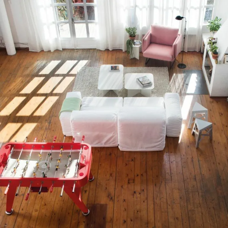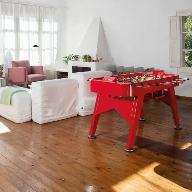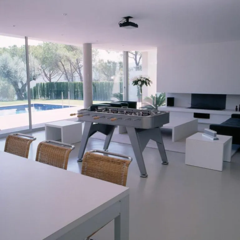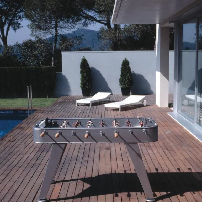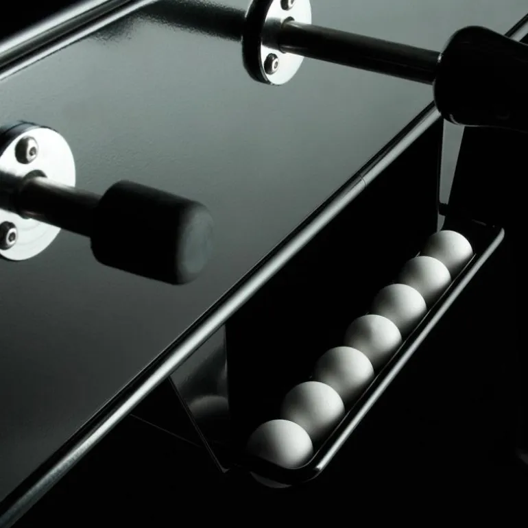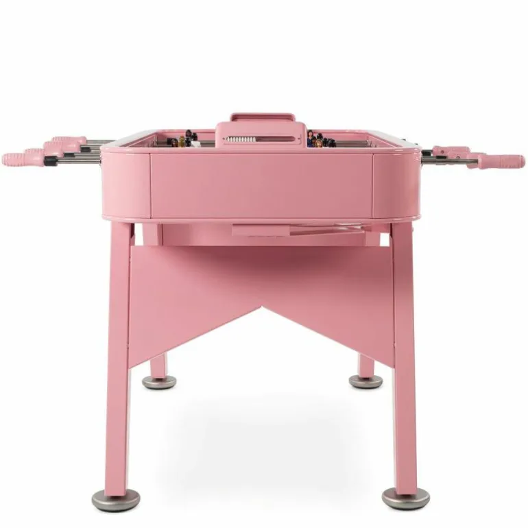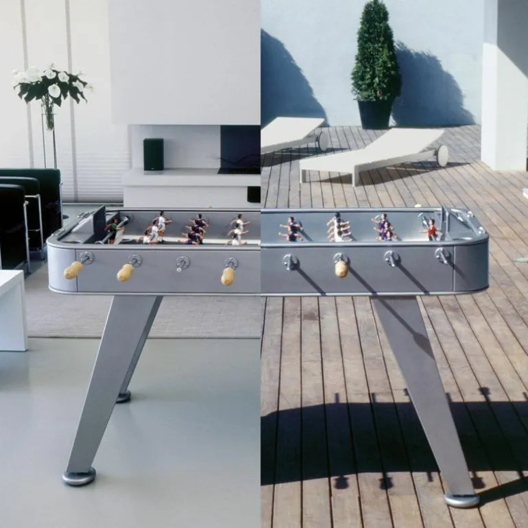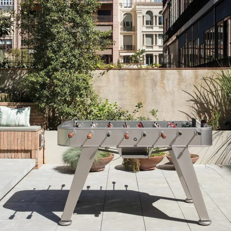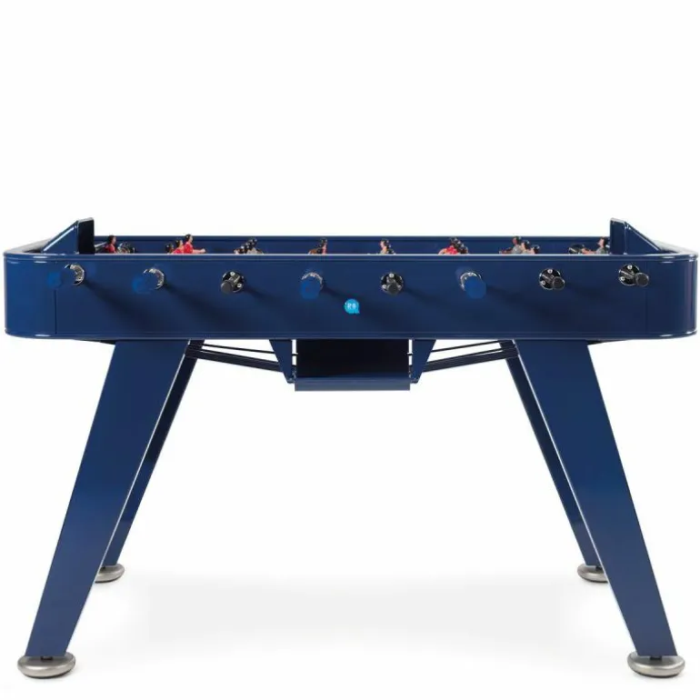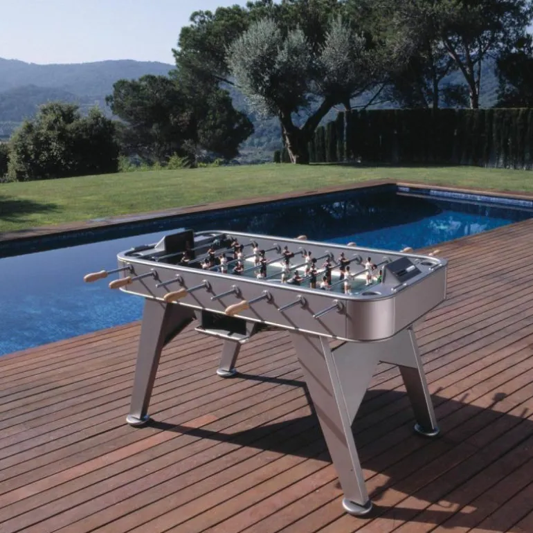 Deze tijdloze voetbaltafel past dankzij zijn tijdloze uitstraling in iedere setting en ruimte, van partijen binnenshuis tot een wedstrijd in het zonnetje buiten. Dankzij de ingebouwde bekerhouders die elk aan een uiteinde van de tafel ingebouwd zijn kunt u tijdens het potje ook genieten van een verfrissende dorstlesser. De tafel wordt geleverd met standaard teams, maar kan helemaal naar eigen wens worden aangepast met exclusieve team-kits. De RS2 is vervaardigd van sterk metaal in verschillende elegante kleuren, en is verkrijgbaar in een indoor variant en een in-/outdoor variant. Het tafelblad is gemaakt van hoge druk laminaat en vormt de ondergrond voor de spelers van gegoten aluminium, die vastzitten aan een stalen buis met houten handvatten.r