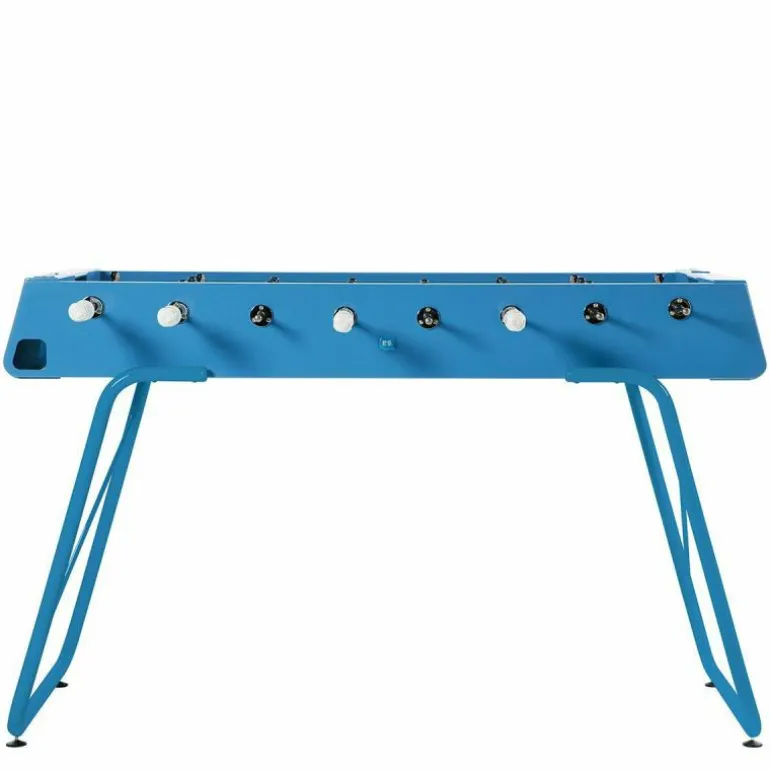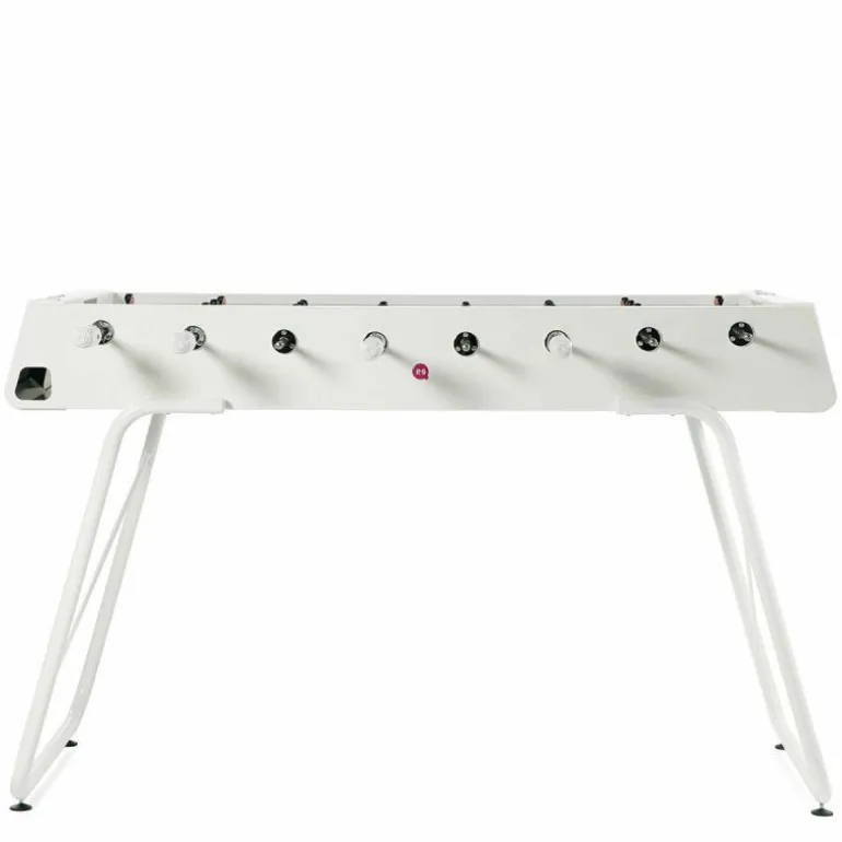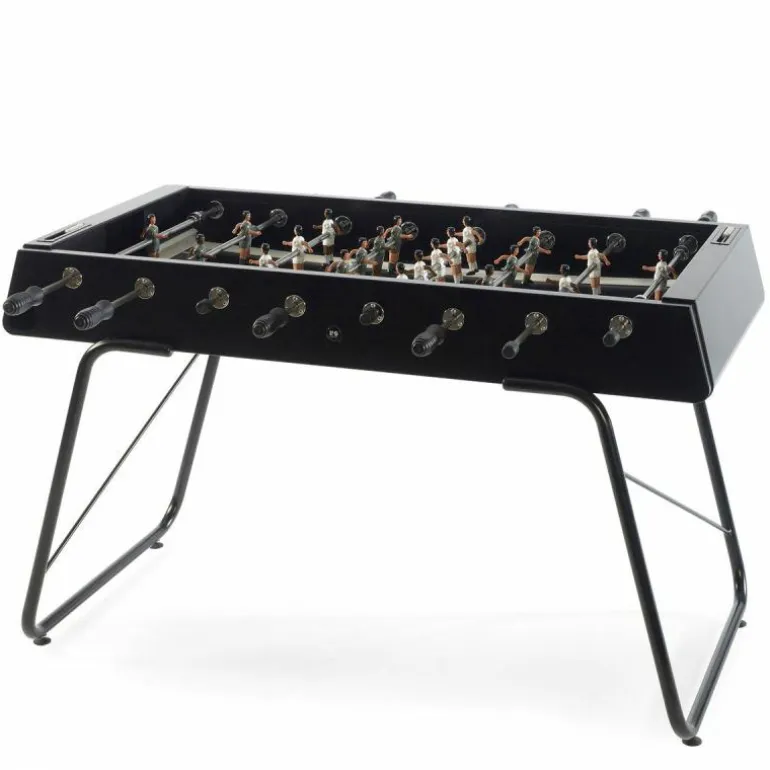 Deze tijdloze voetbaltafel past dankzij zijn tijdloze uitstraling in iedere setting en ruimte, van partijen binnenshuis tot een wedstrijd in het zonnetje buiten. Dankzij de ingebouwde bekerhouders die elk aan een uiteinde van de tafel ingebouwd zijn kunt u tijdens het potje ook genieten van een verfrissende dorstlesser. De tafel wordt geleverd met standaard teams, maar kan met exclusieve team-kits helemaal naar eigen wens worden aangepast. De RS3 is vervaardigd van sterk metaal in verschillende elegante kleuren, een tafelblad gemaakt van hoge druk laminaat en spelers van gegoten aluminium die vastzitten aan een stalen buis met houten handvatten. De voetbaltafel is geschikt voor zowel binnen- als buitengebruik.r