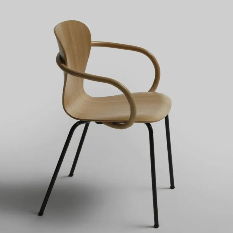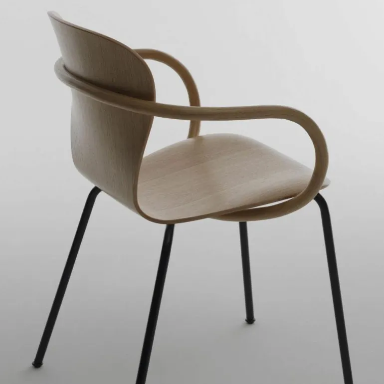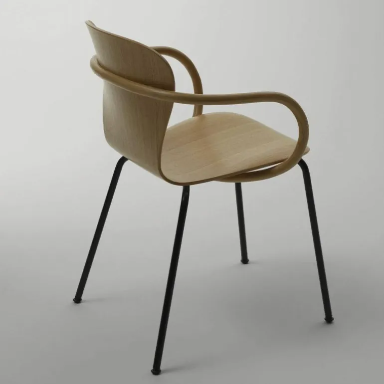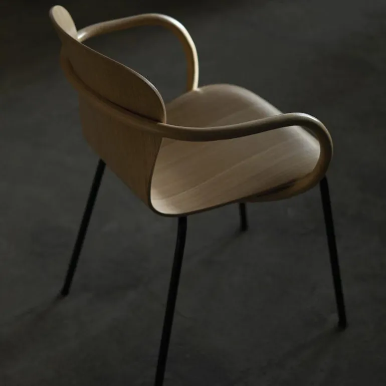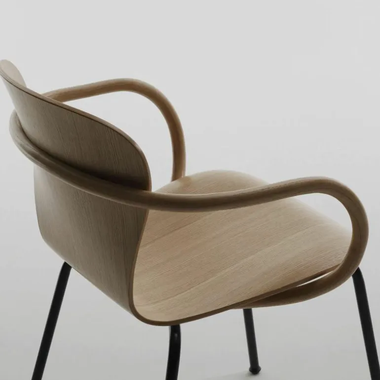 De S 220 F Stoel Met Armleuning heeft een zitschaal en rugleuning van voorgevormd multiplex in gevernist eiken, gebeitst eiken en gevernist walnoothout. De zitting wordt gedragen door een buisvormig onderstel van verchroomd of gepoedercoat staal in verschillende kleuren. Het stalen frame voorziet het klassieke hout van een moderne touch. De stoel is materiaal besparend waardoor hij bijzonder duurzaam is.