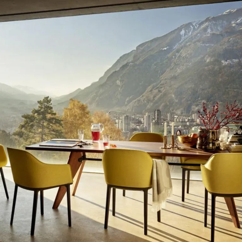 De degelijke houten componenten en de geoliede afwerking van de Table Solvay zorgen voor een comfortabel en verfijnd uiterlijk dat tegenwicht biedt aan de technische nuchterheid van het ontwerp.r