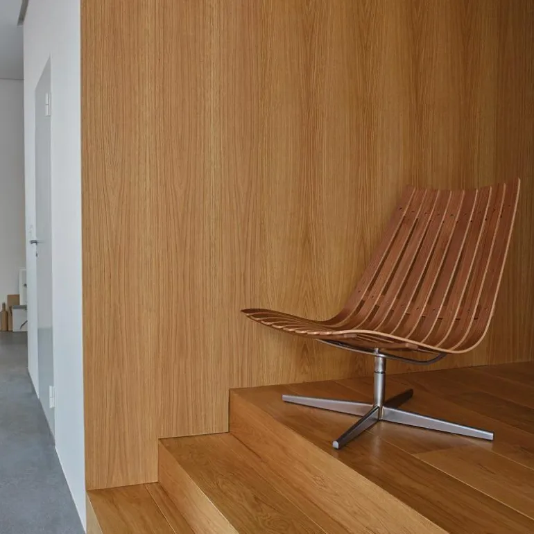 De loungestoel is 81 centimeter hoog, 66 centimeter breed, 78 centimeter diep en heeft een zithoogte van 28 centimeter. De zitting is gemaakt van eikenhoutfineer met een onderstel in satin chroom. Voor het onderstel kunt u kiezen tussen het stevige Bolt onderstel of het praktische Swivel onderstel.