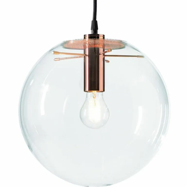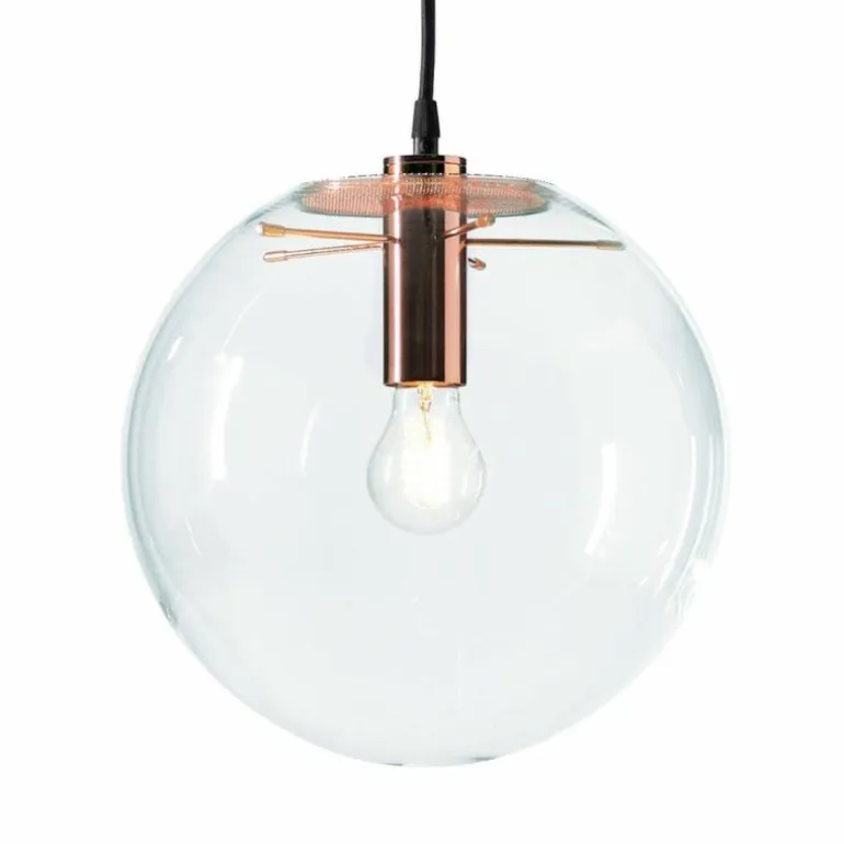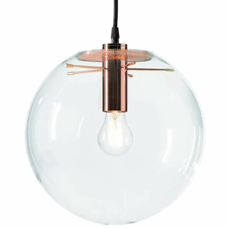 De hanglamp bestaat uit een mondgeblazen glazen bol van transparant glas, voorzien van verkopert metaal waar de bol aan bevestigd is. De lamp is voorzien van een zwarte kabel.r