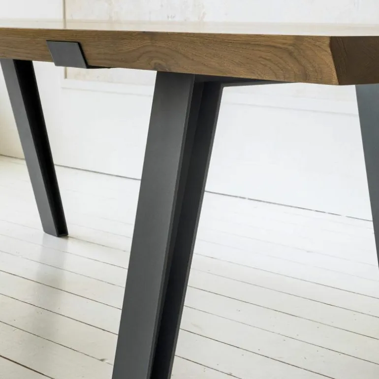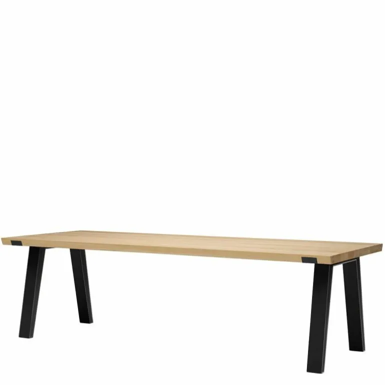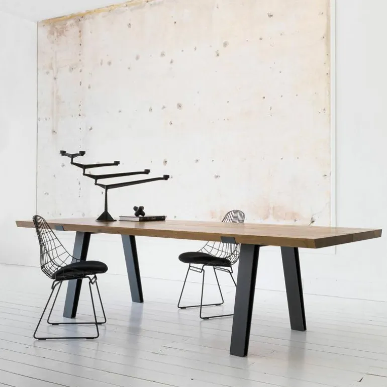 Het zwart stalen frame heeft een lichte uitstraling doordat de binnenzijden van de poten bijna volledig hol zijn en doordat het frame aan de bovenzijde stijlvol in het houten tafelblad is verzonken. Het frame is gemaakt met laser cut-technologie. Het tafelblad van de rechthoekige Side-to-Side tafel bestaat uit twee delen met een dunne gleuf precies in het midden; een verfijnd detail! De houten bladen zijn gemaakt duurzaam Frans eiken. r
