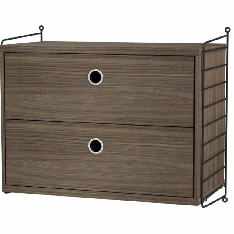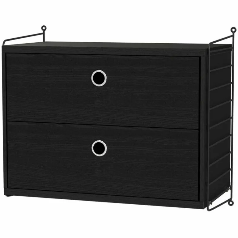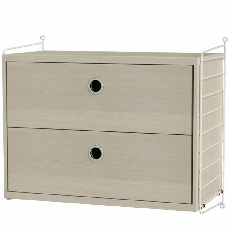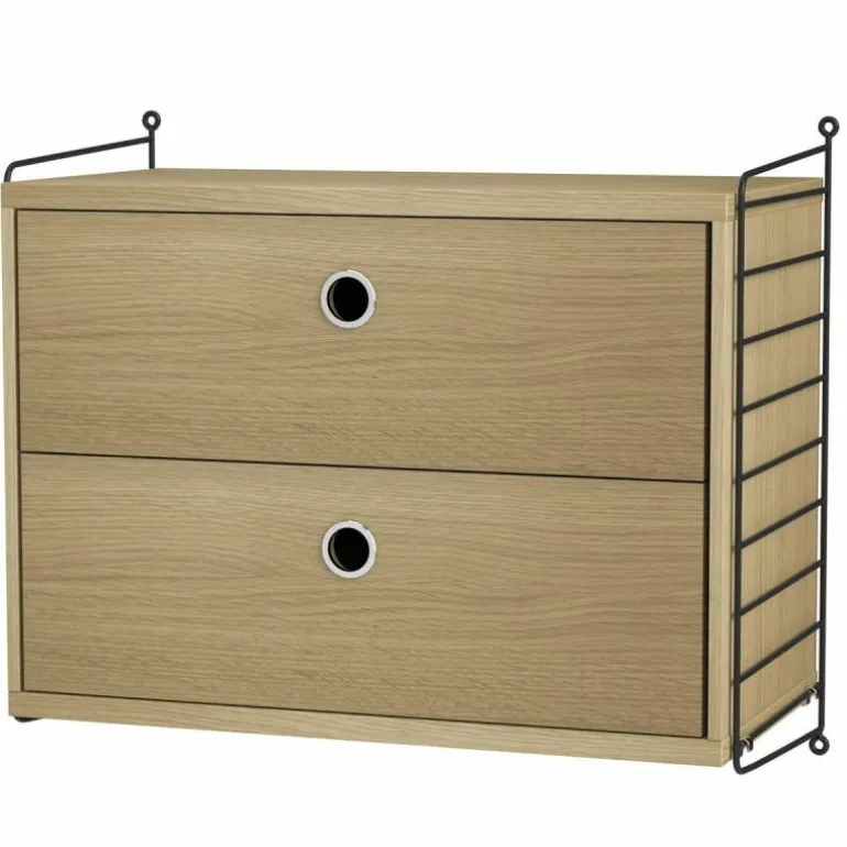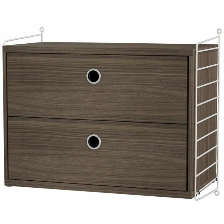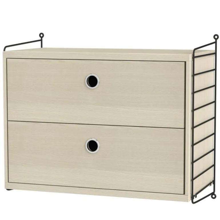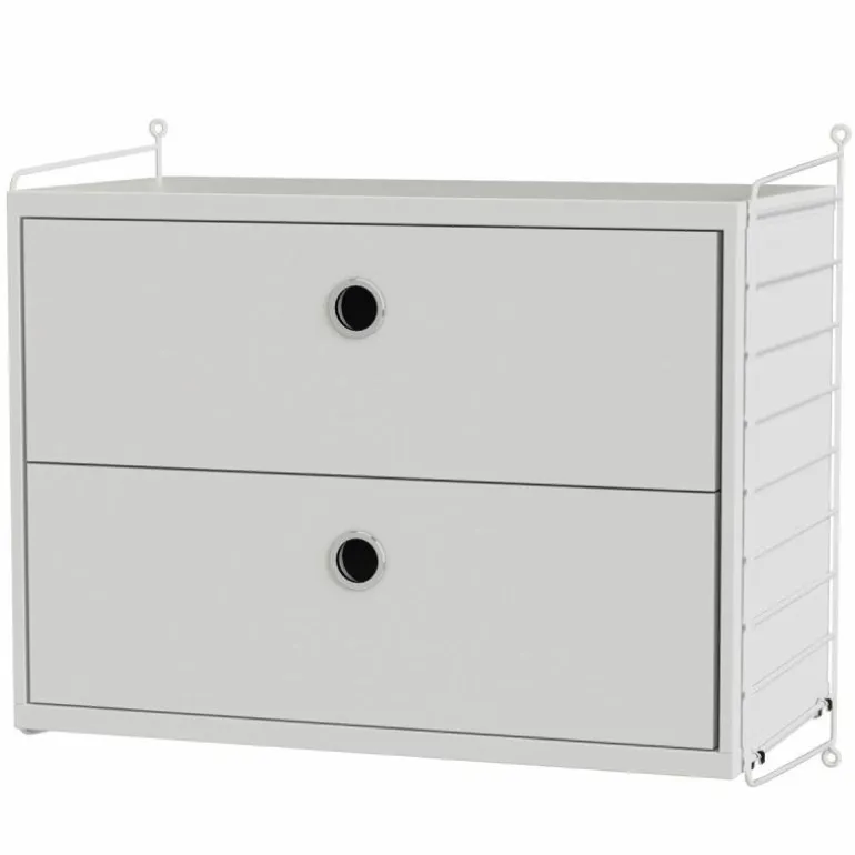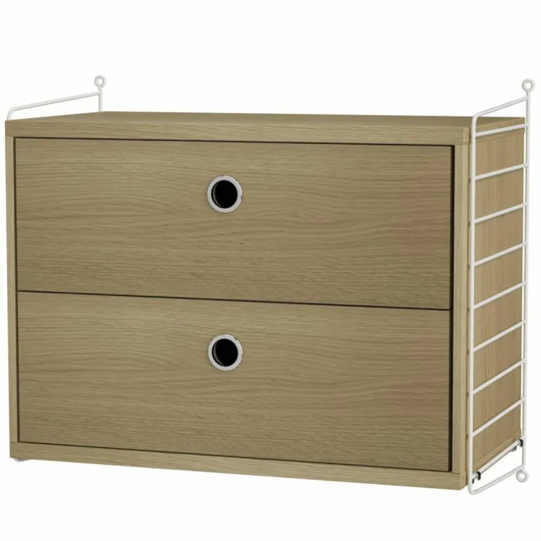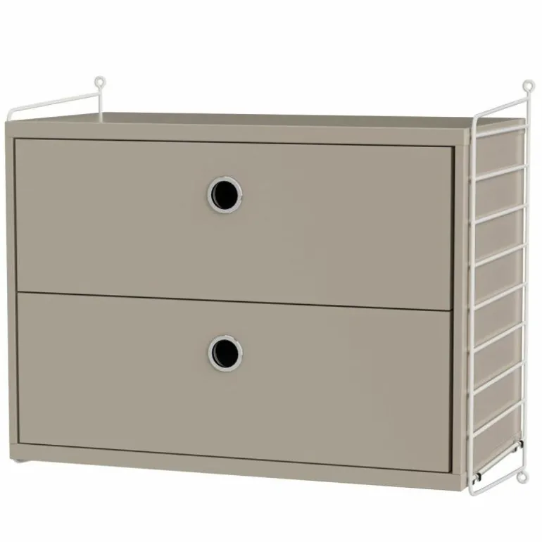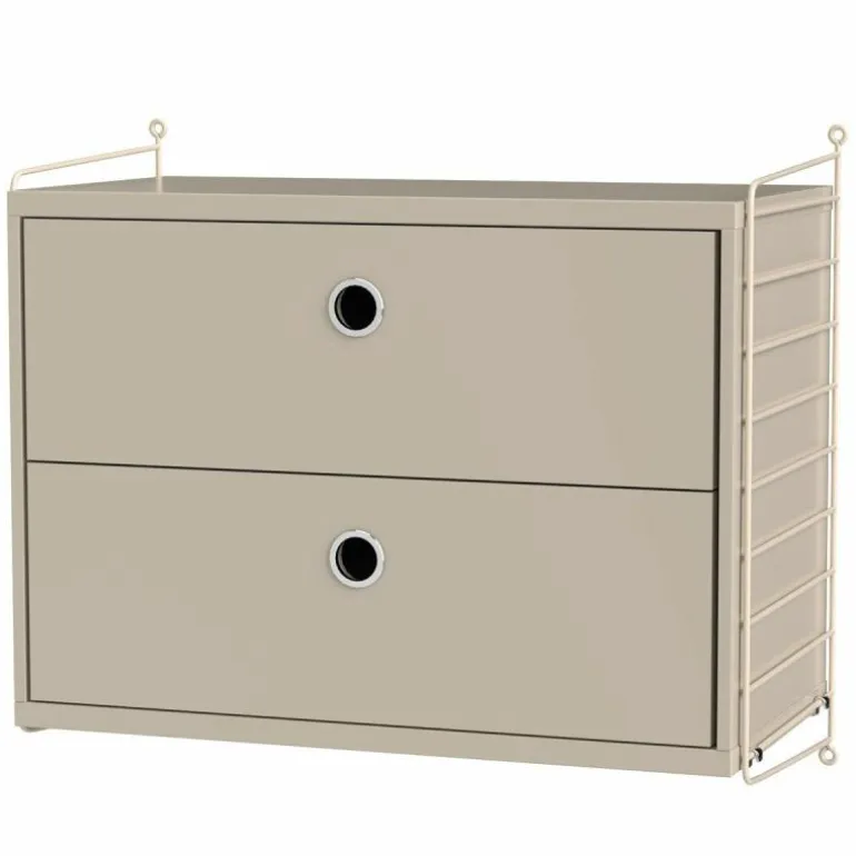 Deze samenstelling leent zich perfect als nachtkastje of cabinet onder een spiegel in de slaapkamer. Het is een eenvoudige configuratie waarbij een ladekast, voorzien van twee laadjes, tussen twee metalen wandrekken is gehangen. De kast biedt ruimte om diverse spullen buiten het zicht op te bergen, tegelijkertijd kan bovenop het kastje bijvoorbeeld een lampje geplaatst worden.r