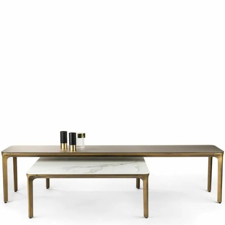 Zo heeft u de keuze uit een blad van gelakt, ‘Net’ of ‘Frosted’ glas, keramiek, hout, HPL of ‘Materia’, een speciale ruwe glassoort die door Sovet ontwikkeld is. Iedere materiaalsoort kent verschillende kleurmogelijkheden en is bovendien verkrijgbaar met een aparte afwerking aan de randen. De randen van de ‘Materia’, hout en HPL uitvoering lopen bijvoorbeeld aan de bovenzijde zacht af, en de glazen en keramiek uitvoeringen beschikken juist over een recht blad. Het frame en de poten zijn beide gemaakt van aluminium en tevens te voorzien van een moderne kleur lak. r
