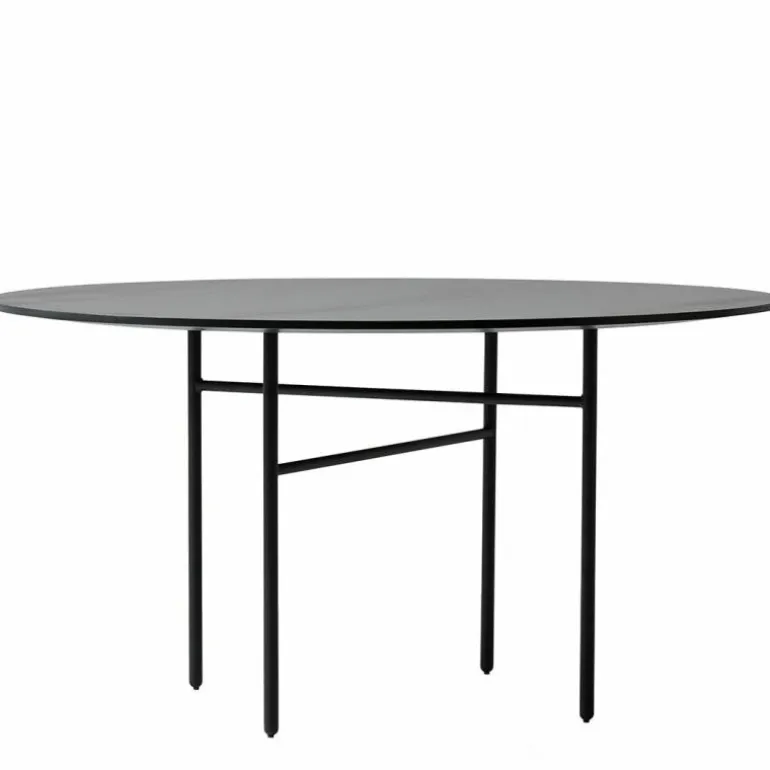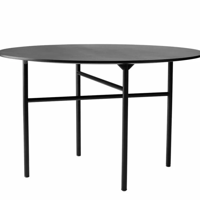 U kunt kiezen uit drie verschillende uitvoeringen voor het tafelblad: zwart gelakt eiken fineer waarbij de nerven goed zichtbaar zijn of houtskool zwart linoleum. Het frame bestaat uit stevige stalen buizen welke zijn afgewerkt met een zwarte poedercoating en die het tafelblad met gemak dragen. De ronde tafel is uitgebracht in een diameter van 120 centimeter en een diameter van 138 centimeter. De Snaregade Tafel is behalve als ronde tafel ook verkrijgbaar in een ovale uitvoering en een rechthoekige uitvoering. Deze uitvoeringen kunt u onderaan de pagina vinden bij ‘Productfamilie’.r