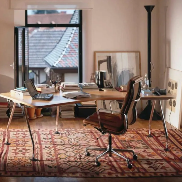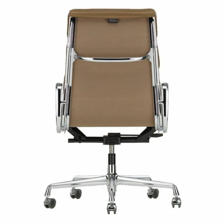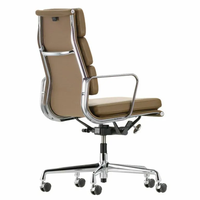 Soft Pad Chair EA 219 Bureaustoel is in 1969 ontworpen en ontwikkeld door Charles & Ray Eames en behoort tot de waanzinnige collectie van het merk Vitra. Zowel wat betreft bouw als vorm lijken deze stoelen op de Aluminium Chairs. Ze behoren dan ook tot dezelfde serie; de Aluminium Group. Echter bij de Soft Pad Chair contrasteren de opgenaaide lederen kussens op een opvallende maar prachtige manier met het slanke aluminiumprofiel. De Soft Pad Chairs zijn bovendien zachter en luxueuzer dan de stoelen uit de Aluminium Group, met behoud van dezelfde strakke vorm. De stoelen passen zich geheel aan het lichaam aan en bieden daardoor een buitengewoon zitcomfort!r