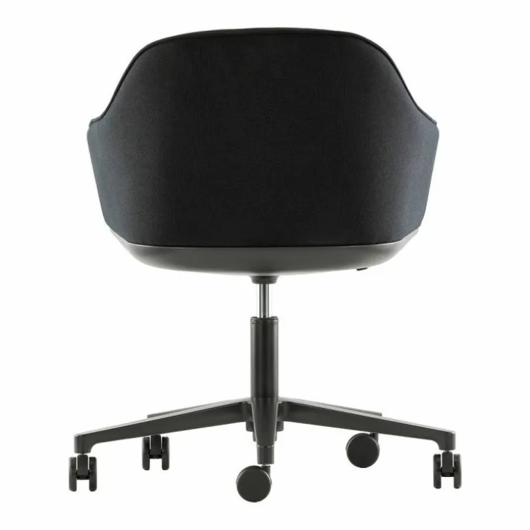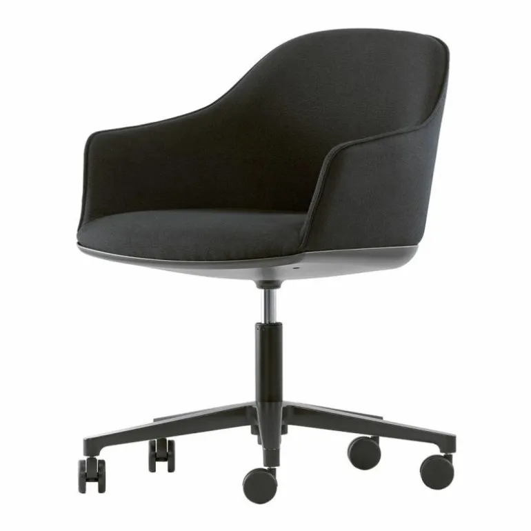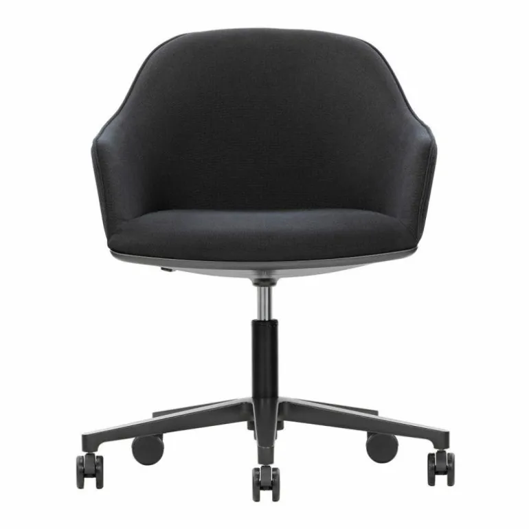De VitraSoftshell Bureaustoel is een ontwerp van Ronan & Erwan Bouroullec. De combinatie van de uitnodigende uitstraling met de zachte bekleding zorgt ervoor dat de Softshell een geliefde bureaustoel is. De stoel heeft een vijfsteronderstel van gepoedercoat (basic dark) of gepolijst aluminium naar keuze. De rugleuning en zitting worden gemaakt van glasvezelversterkt polyamide dat bedekt wordt met polyurethaanschuim voor een hoogwaardig comfort. Voor de bekleding van de stoel heeft u de keuze uit stof en leder uit verschillende groepen in verschillende uitvoeringsmogelijkheden. De armleuningen zijn geïntegreerd in de zitschaal. Voor een optimaal ergonomische houding is de bureaustoel in hoogte te verstellen van minimaal 76.5 centimeter hoog tot maximaal 89.5 centimeter hoog. Hierbij hoort een zithoogte van 38.5 centimeter respectievelijk 50 centimeter hoog. De stoel zelf is 62 centimeter breed en 56.5 centimeter diep, de diameter van het onderstel bedraagt 77 centimeter. r