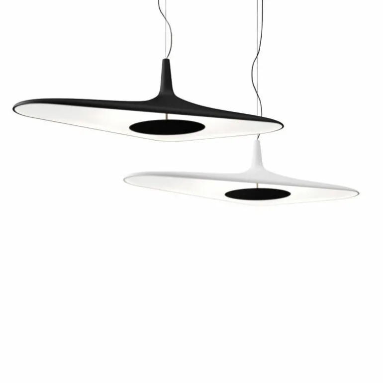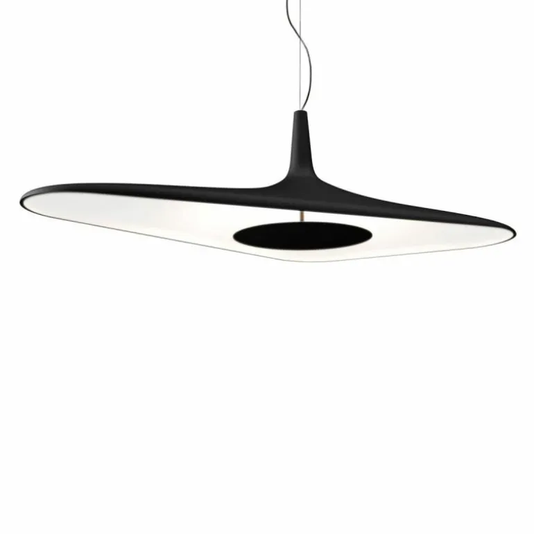 De lampvorm van de Soleil Noir is opgebouwd uit gegoten polyurethaanschuim. De organische vorm geeft de lamp een futuristische en technologische uitstraling. Een geïntegreerde LED lichtbron is verborgen in de cirkelvormige schijf en zorgt voor een homogene diffuse, indirecte verlichting. Deze dimbare lichtbron heeft een sterkte van 35 Watt. Naar keuze is de lamp geheel in het wit of in de kleuren wit/zwart verkrijgbaar. Qua afmetingen heeft de hanglamp een lengte van 120 centimeter, een breedte van 62,5 centimeter en een hoogte van 35 centimeter. Een meegeleverde plafondkap zorgt voor een stijlvolle montage van de lamp. Naar wens is de lamp te monteren met een ophanghoogte tussen de 45 en 320 centimeter. r
