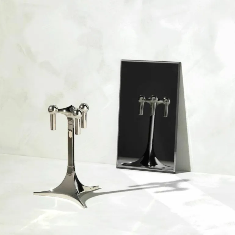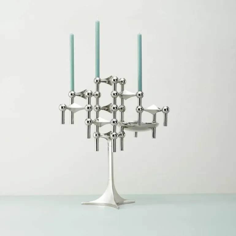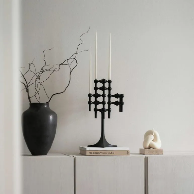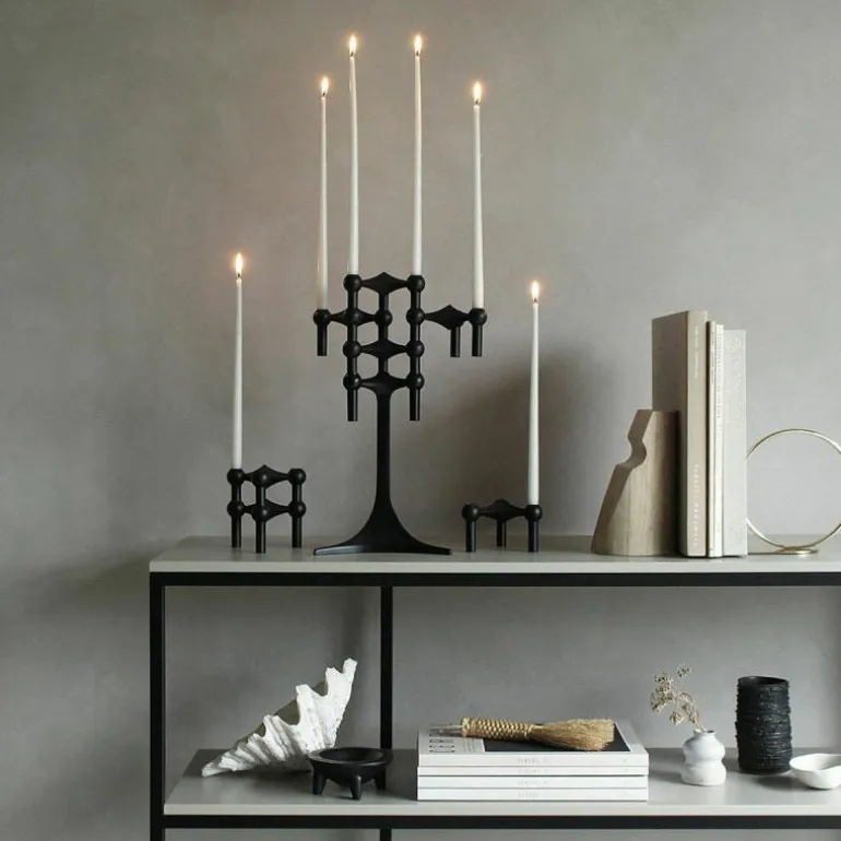 Binnen de STOFF Nagel collectie kan de kandelaar worden gecombineerd met andere producten, zoals standaards, schalen en vazen. Door deze combinatie ontstaat een samenhangend geheel waarin alle onderdelen dezelfde vormentaal en afwerking delen. Dit modulaire karakter maakt het systeem aantrekkelijk voor interieurs waarin flexibiliteit gewenst is, zoals horeca, ontvangstruimtes, showrooms en woonomgevingen. Ook zonder kaarsen behoudt de kandelaar zijn functie als zelfstandig object binnen een compositie.