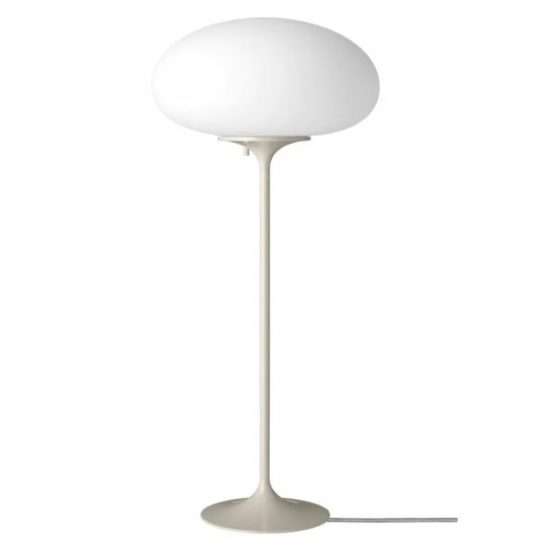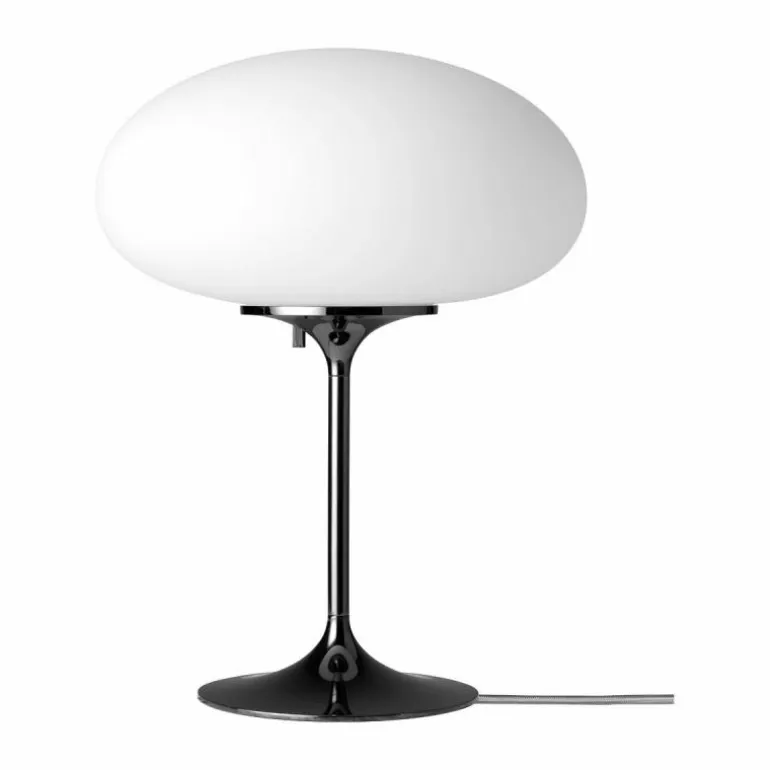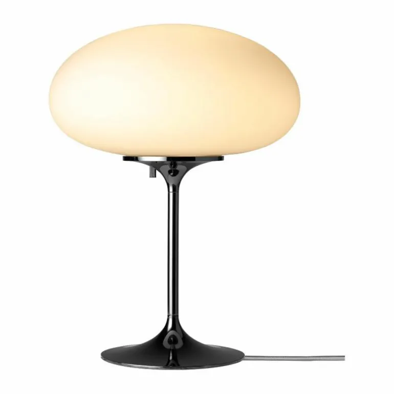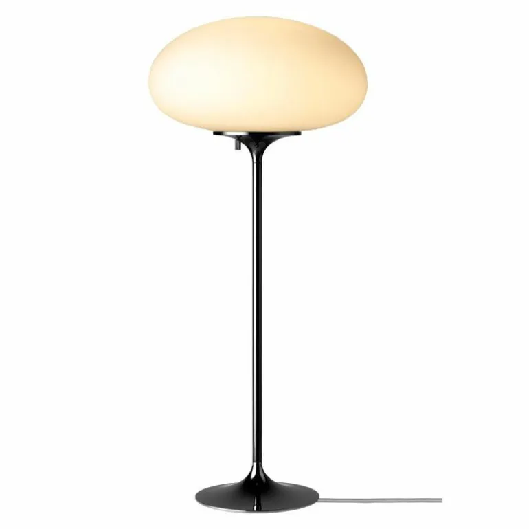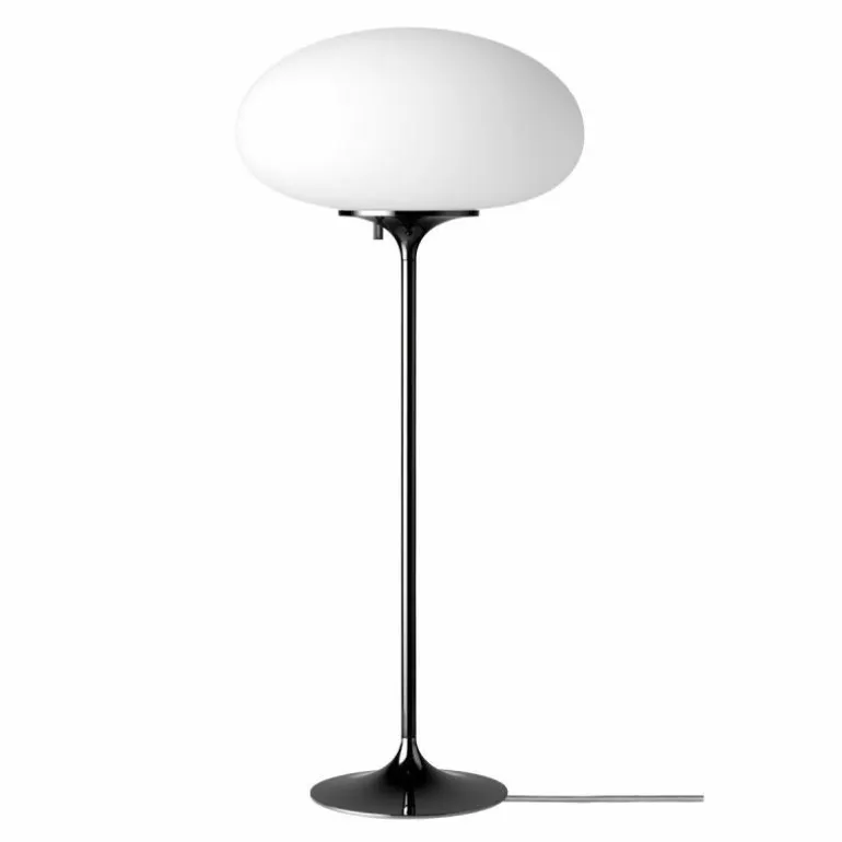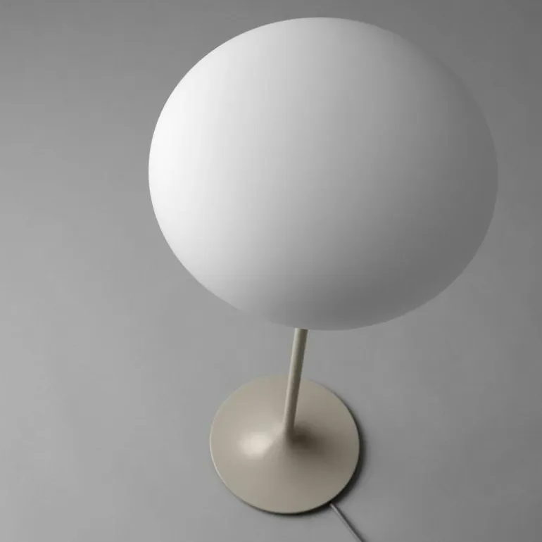 De tafellamp is verkrijgbaar in de kleuren Pebble Grey, Black Red en Black Chrome en u heeft de keuze uit twee hoogtematen. U kunt kiezen voor een hoogte van 42 centimeter of een hoogte van 70 centimeter. Beide lampen hebben een glazen kap met een diameter van 31 centimeter en een voet met een diameter van 18 centimeter. Elke uitvoering heeft een koord omhuld met witte stoffering. De lamp heeft een E27 fitting en Gubi raadt aan om gebruik te maken van een lichtbron met frosted glas om het design zo goed mogelijk tot zijn recht te laten komen.r