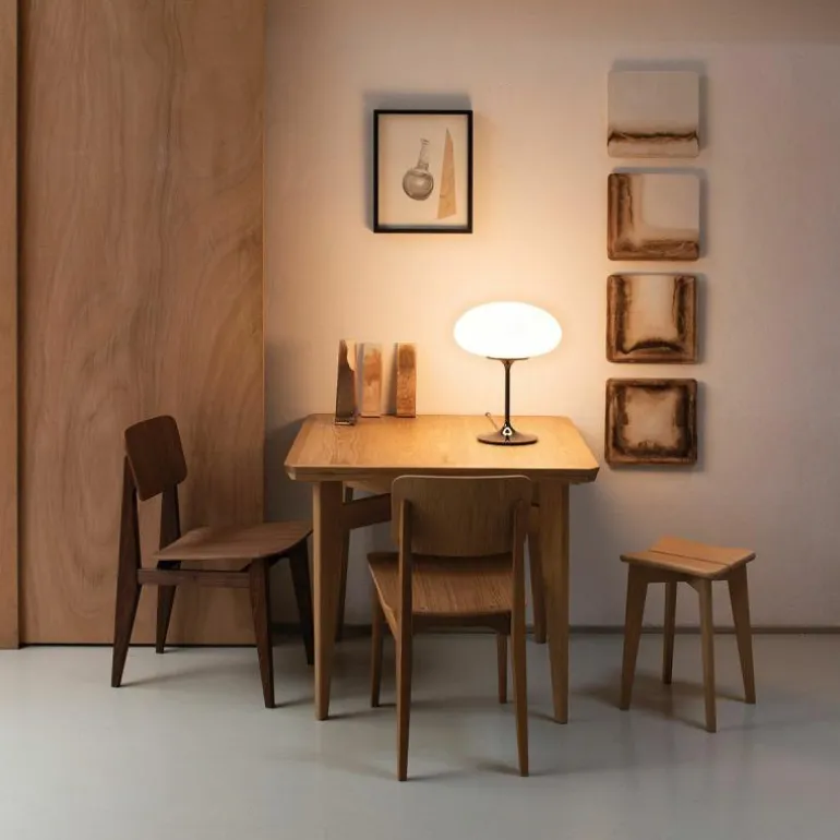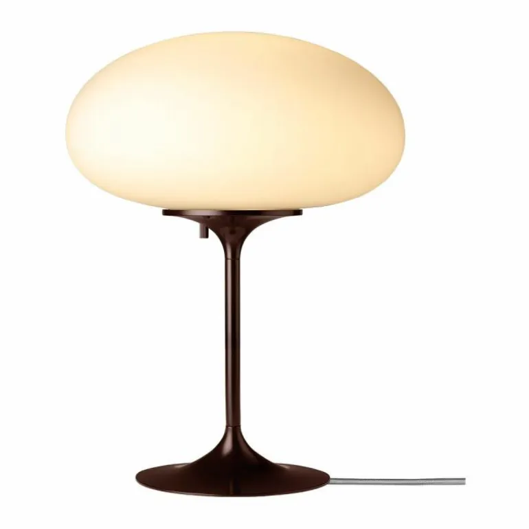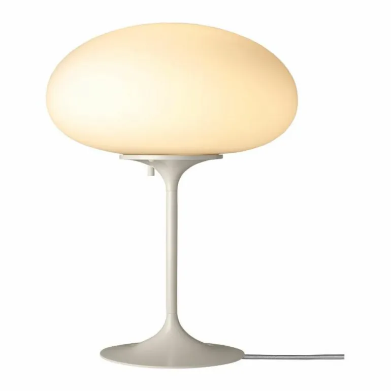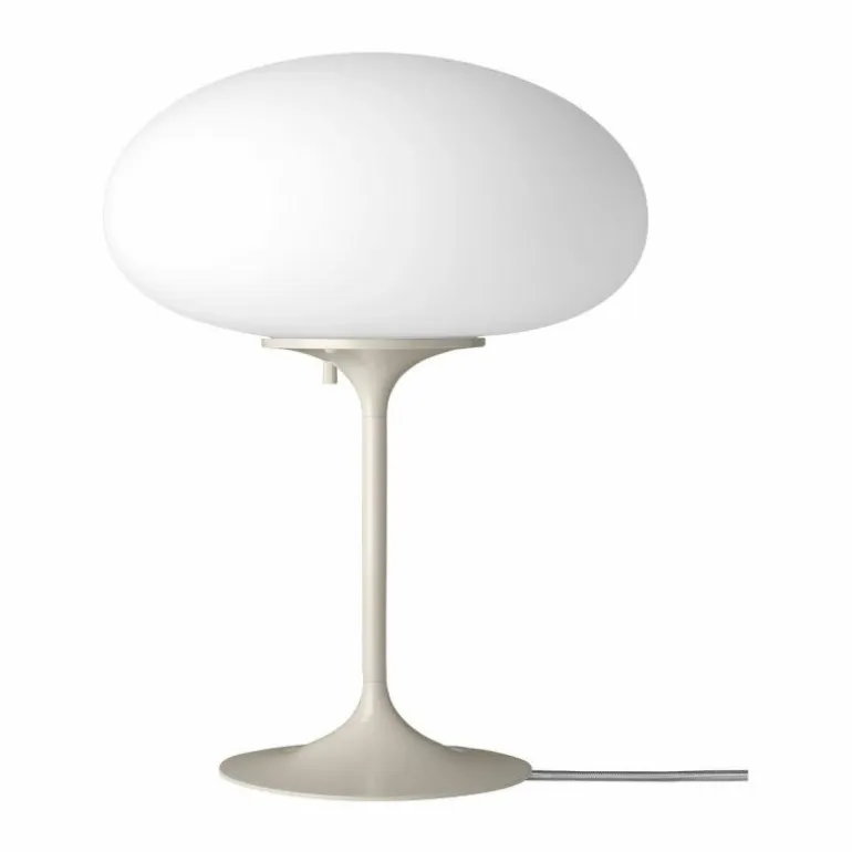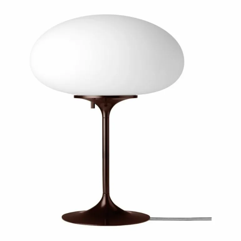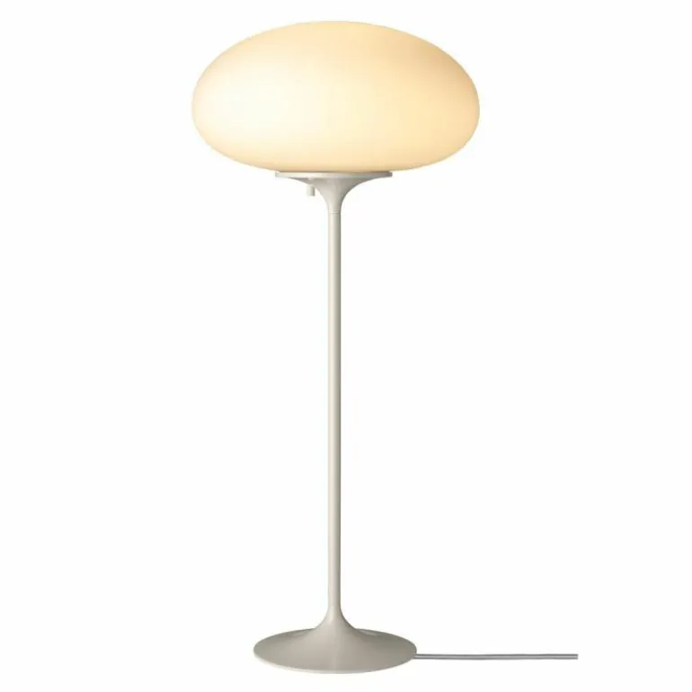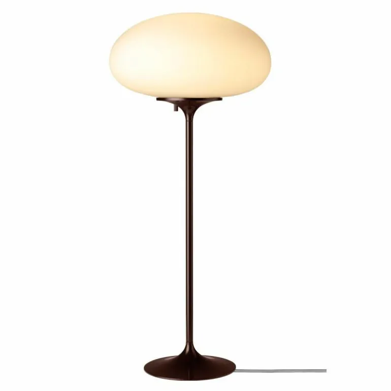 De tafellamp is verkrijgbaar in de kleuren Pebble Grey, Black Red en Black Chrome en u heeft de keuze uit twee hoogtematen. U kunt kiezen voor een hoogte van 42 centimeter of een hoogte van 70 centimeter. Beide lampen hebben een glazen kap met een diameter van 31 centimeter en een voet met een diameter van 18 centimeter. Elke uitvoering heeft een koord omhuld met witte stoffering. De lamp heeft een E27 fitting en Gubi raadt aan om gebruik te maken van een lichtbron met frosted glas om het design zo goed mogelijk tot zijn recht te laten komen.r