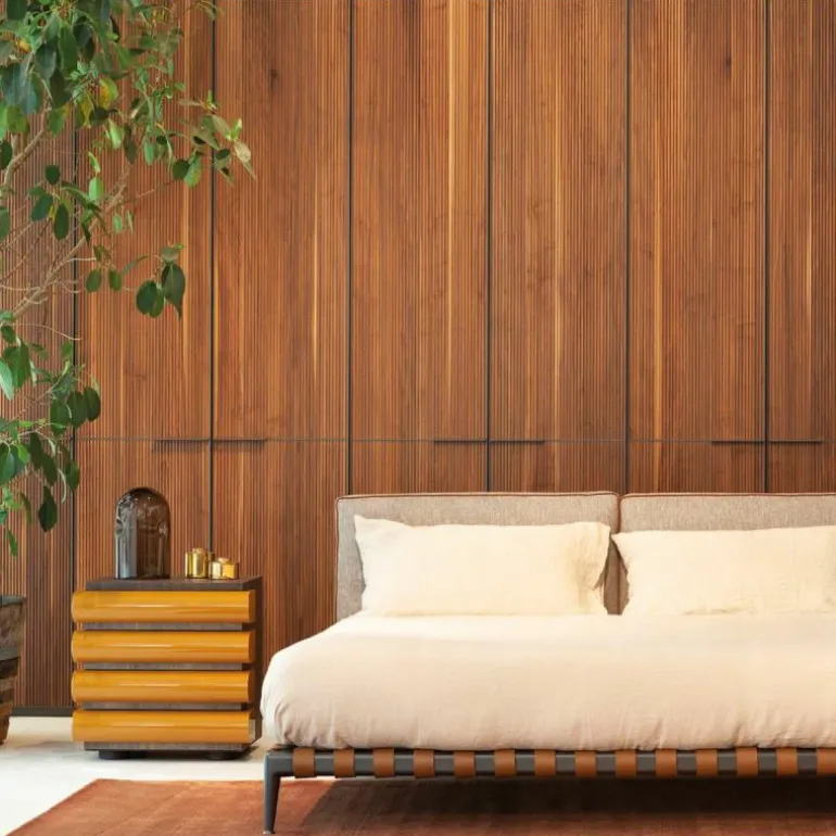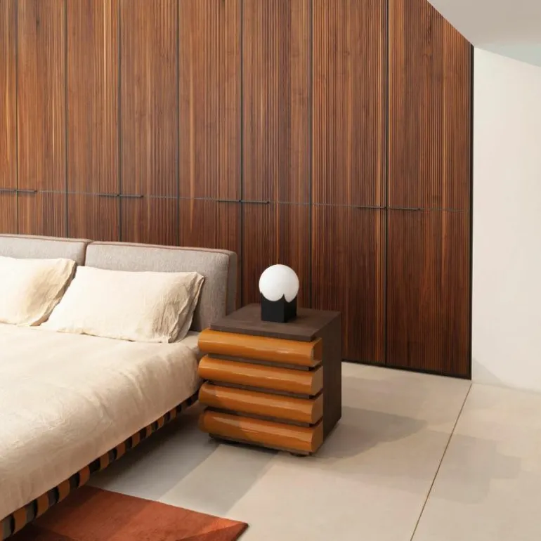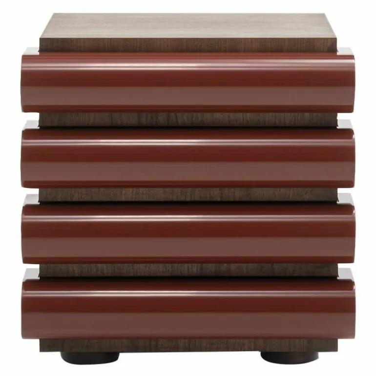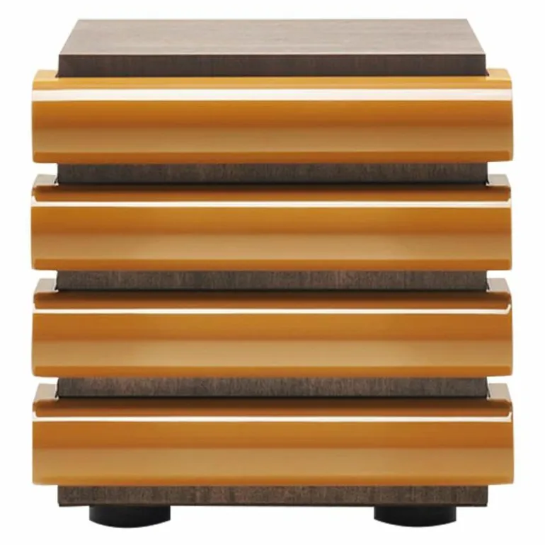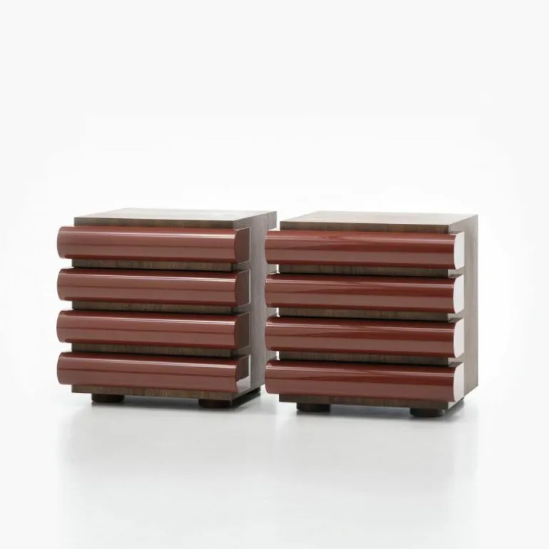 De ladekast is voorzien van een houtfineer in zwart essen of donker gebeitst walnoot. Door het gebruik van deze materialen ontstaat er een bijzondere samensmelting tussen het houtfineer en de hoogglans lak. Het zwart essenfineer zorgt voor een mooi contrast en vertoont na behandeling nog altijd de natuurlijke aders van essenhout. Bij het walnootfineer ontstaat er een warme sfeer met zachte kleurvariaties dat door zijn donkere kleurtint de elegantie van het materiaal verstrekt. Daarnaast is de kast uitgerust met gewichten om de stabiliteit te vergroten. Hierdoor staat de kast stevig en maakt hem naast het zijn van een bijzondere verschijning ook nog eens uiterst functioneel.r