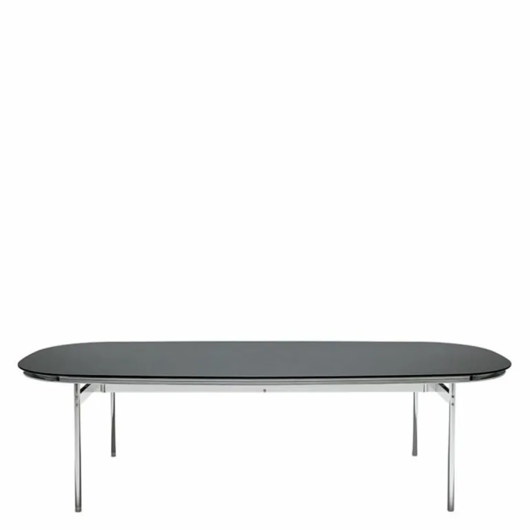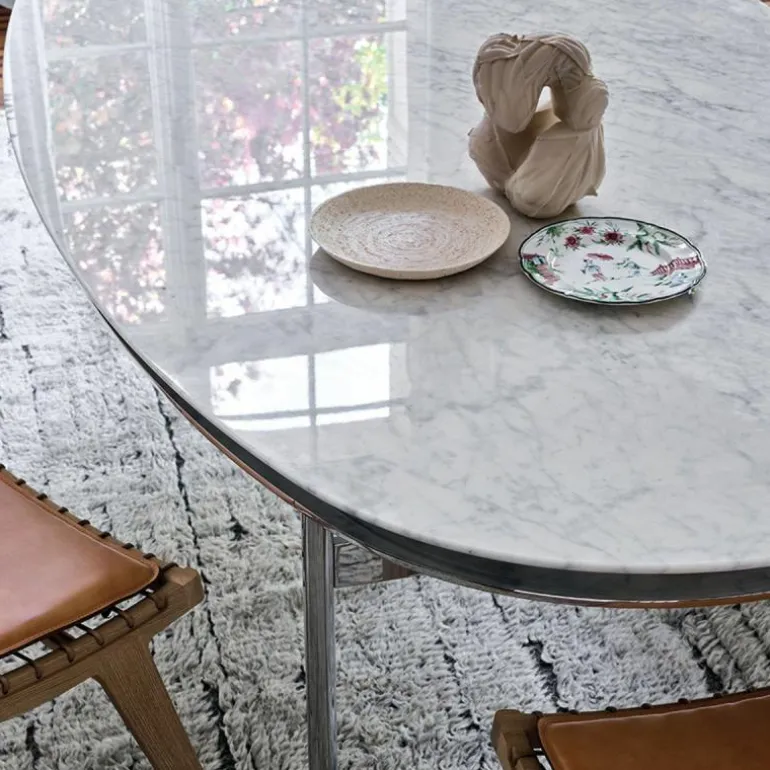 De Table Collection Eettafel heeft een stalen onderstel met een zwarte of gepolijste afwerking. Het ruime blad is verkrijgbaar in zwart glas en Marquina of Statuarietto marmer. Bovendien is het tafelblad uitgevoerd in een rechthoekige of ovale vorm in diverse formaten:r