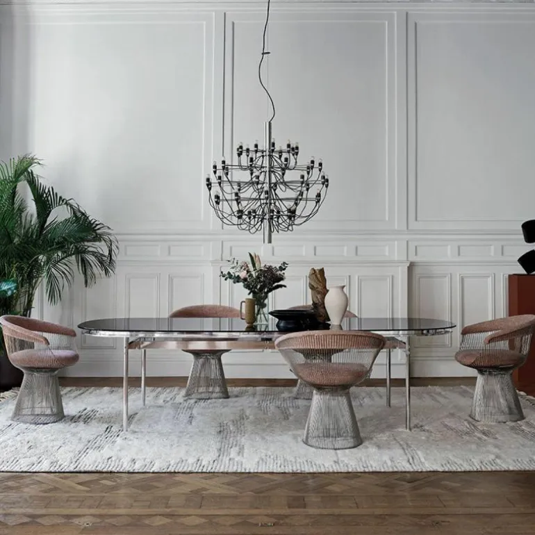 De Knoll Table Collection Eettafel is een ontwerp van Antonio Citterio. De Table Collection omvat een reeks tafels waarbij het aluminium onderstel centraal staat. Het karakteristieke onderstel straalt een geometrische eenvoud uit en is geïnspireerd op het designmotto van de beroemde Mies van der Rohe: ‘Less is More’. De ranke tafelpoten dragen een marmeren of glazen tafelblad waarmee een vleugje luxe naar elk interieur wordt gebracht. Ondanks het smalle onderstel staan de tafels bijzonder stevig. Zo worden de poten met elkaar verbonden middels horizontale dwarsbalken welke de tafel tevens voorzien van een stoere look.r