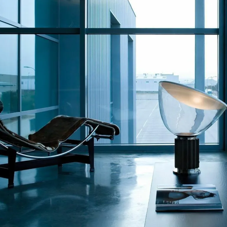 Een praktische, heldere verlichting door de grote reflector en de verspreiding van het licht. Achille en Pier Giacomo Castiglioni zagen de Taccia, die zij in 1962 ontwierpen, als de Mercedes onder de lampen; het symbool van succes. De voet in de vorm van een klassieke zuil heeft hier misschien iets mee te maken. Met hun design van de Taccia streefden de bekende designbroers echter geen prestige na. Ze zochten gewoon een manier om de voet koel te houden.r