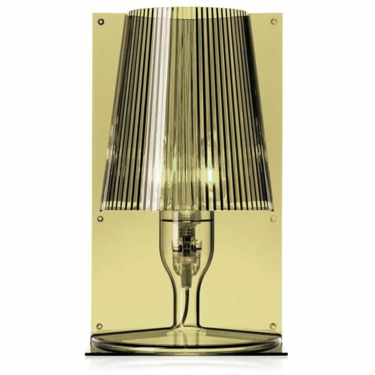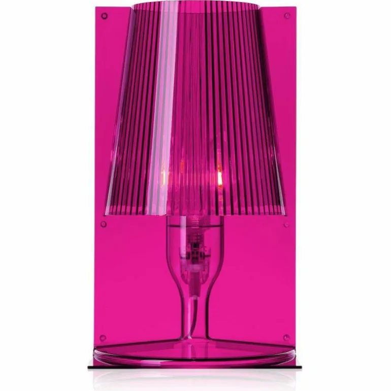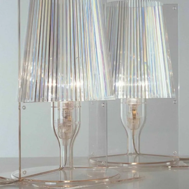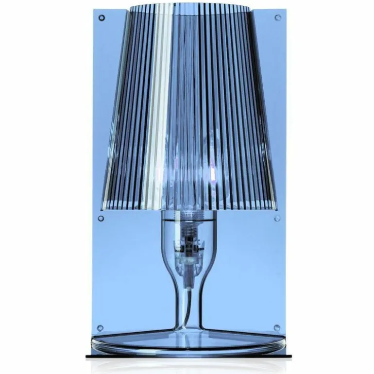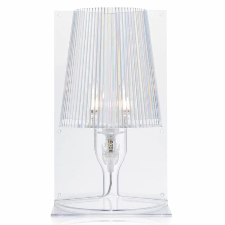 Een aantal van Laviani’s designs hebben een opvallend raakvlak: ze zijn namelijk geïnspireerd op klassieke modellen, maar hebben een moderne, eigenzinnige en licht futuristische look gekregen. Dat zorgt ervoor dat zijn ontwerpen als een frisse wind door het interieur waaien. Ze wekken positieve verbazing. Zo is Kabuki een lamp die met zijn vloeiende vormen en textuur haast een kanten jurk lijkt en heeft de usb-oplaadbare lamp Battery de vorm van een klassiek kristallen tafellampje. Tafellamp Take is, net zoals de voorgenoemde designs van Laviani, uitgevoerd in het hoogwaardige kunststof en met de innovatieve technieken waar Kartell om bekend staat. Het doet qua vorm denken aan de traditionele schemerlamp, maar Take bestaat uit twee tegen elkaar geplaatste plastic platen die elk de vorm en het volume van een halve lamp aannemen en krijgt hiermee een nieuwe, speelse dimensie. r