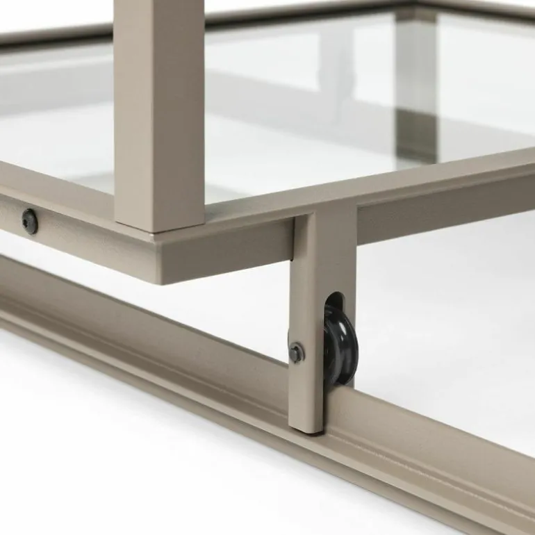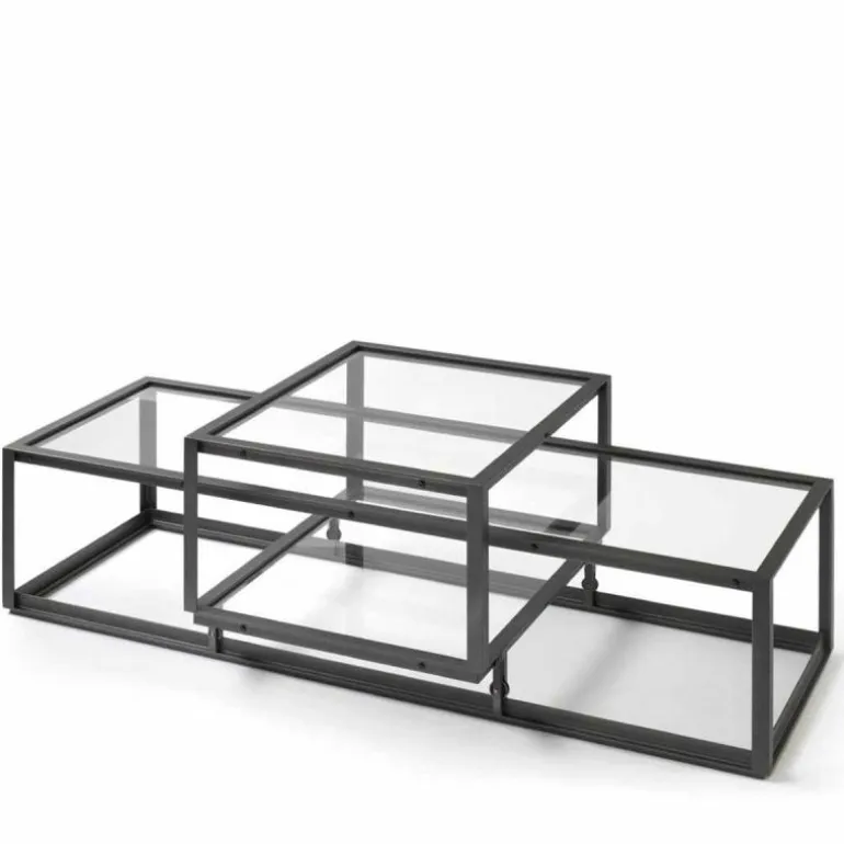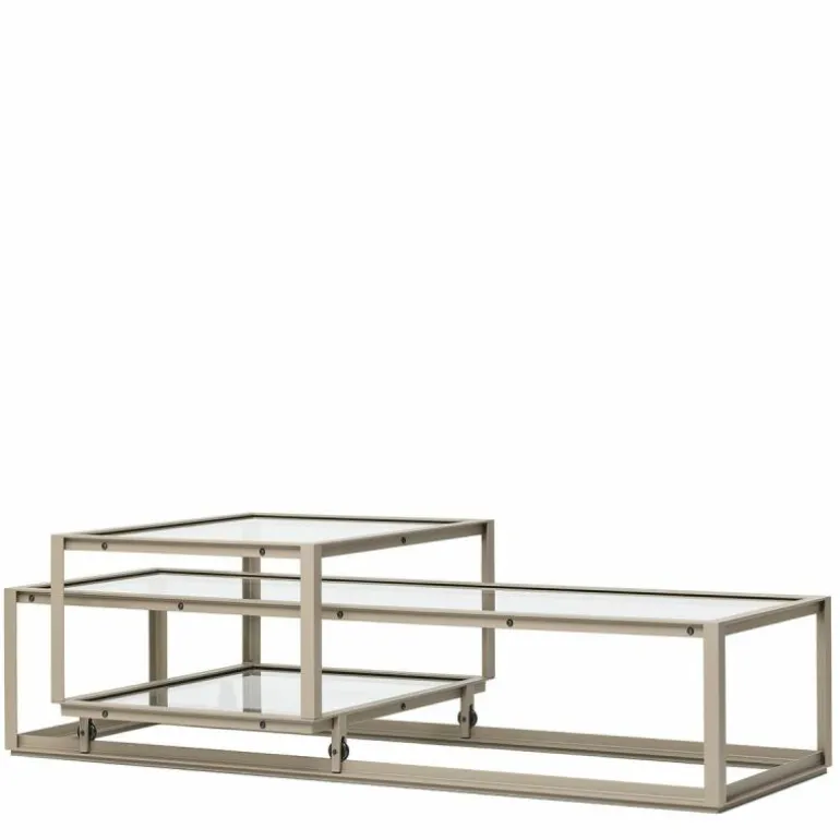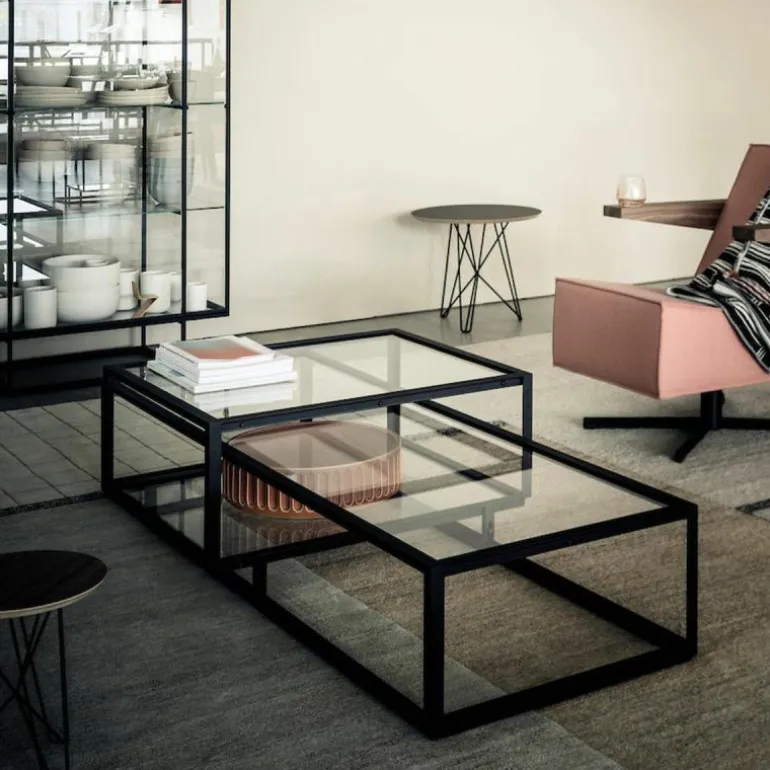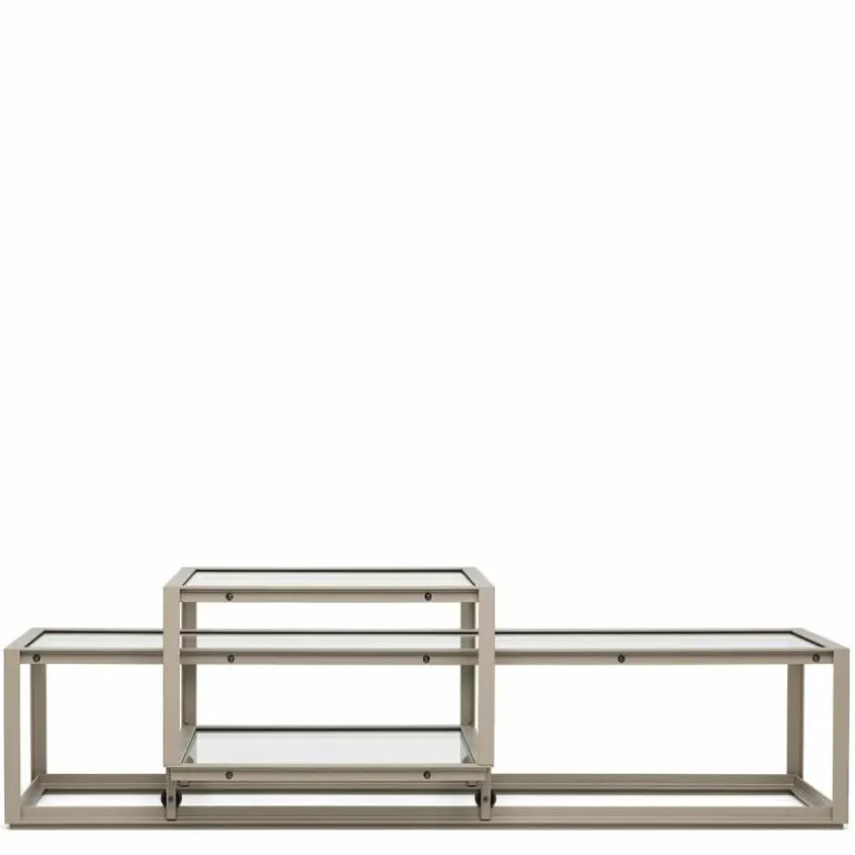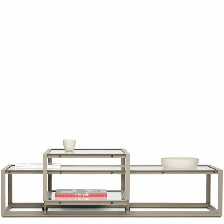 Het frame is vervaardigd uit gepoedercoat metaal met een matte structuur. De afwerking is strak en duurzaam, waardoor het ontwerp zijn kwaliteit behoudt bij langdurig gebruik. De glazen bladen zijn helder en zorgvuldig geplaatst, zodat de constructie en de details van het onderstel goed zichtbaar blijven. De drie niveaus bieden praktische ruimte voor boeken, tijdschriften of decoratieve objecten, terwijl de open structuur luchtigheid en overzicht behoudt.