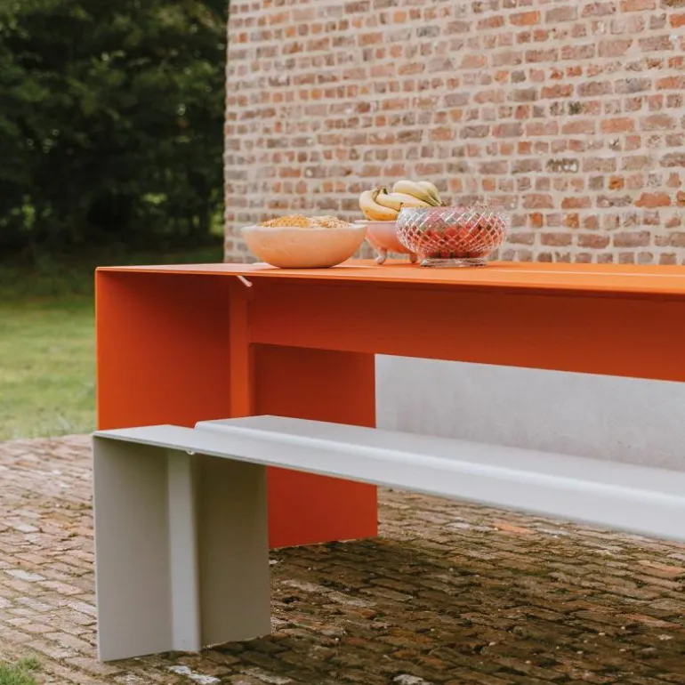 The Bended Tafel is 220 centimeter breed, 80 centimeter diep, 73 centimeter hoog en is standard verkrijgbaar in vier kleuren. De aluminium plaat is 8 millimeter dik met een laag poedercoating. Bent u geïnteresseerd in een RAL-kleur naar keuze? Hiervoor kunt u contact opnemen met onze interieurspecialisten in de winkel of even langs gaan.