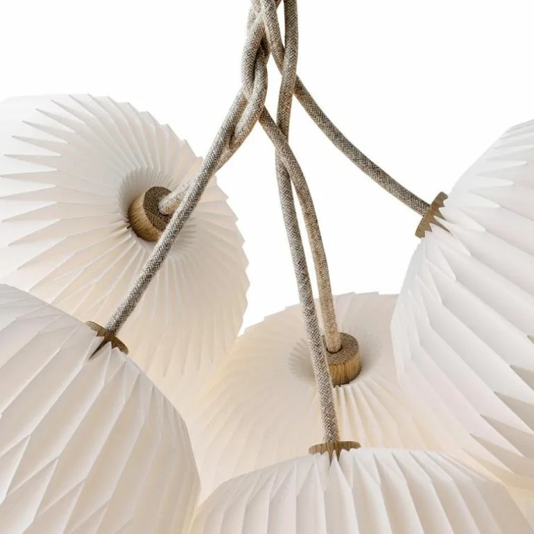 De BOUQUET Hanglamp kan uitgevoerd worden als enkele lamp of als ‘boeket’ met drie of vijf lampenkappen die bij elkaar worden gehouden door een sierlijk gevlochten linnen draad. De verschillende uitvoeringen kunnen samensteld worden uit lampenkappen in drie afmetingen: r