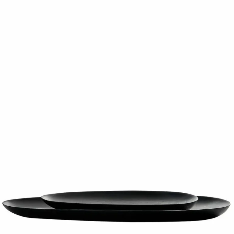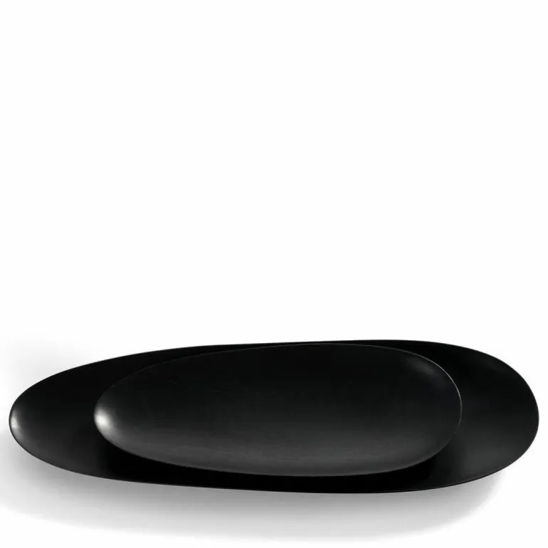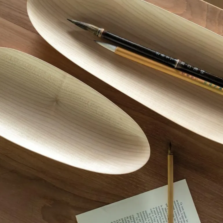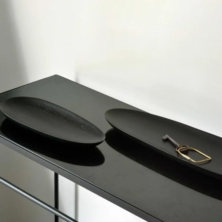 De Thin Oval Borden, Set van 2 is een decoratief en functioneel ontwerp van Ethnicraft. Zo kunt u deze als object op de tafel of op het dressoir plaatsen, maar kunt u de borden ook gebruiken als ondergrond voor kleine accessoires die u in het zicht wil plaatsen. De kleine bordjes zijn verkrijgbaar in drie kleuren en worden door bekwame vaklieden met de hand van massief mahoniehout of essenhout gemaakt. Door het handgemaakte karakter van de borden kan elk exemplaar enigszins verschillen. De set bestaat uit een klein model (b. 32 x h. 3 x d. 13 centimeter) en een groot model (b. 46 x h. 3 x d. 15 centimeter). Let op: de borden zijn geschikt voor droge etenswaren.