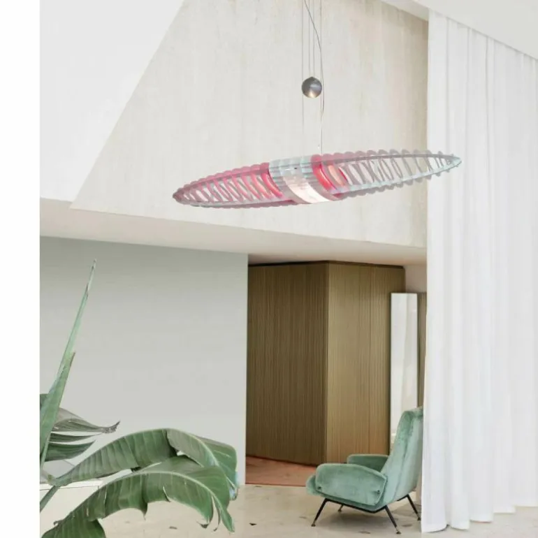 De lamp is opgebouwd uit een stalen draagstructuur met een aluminium lamelvormige behuizing. r