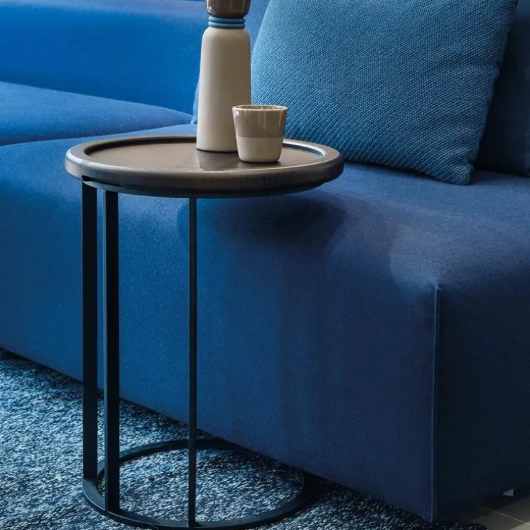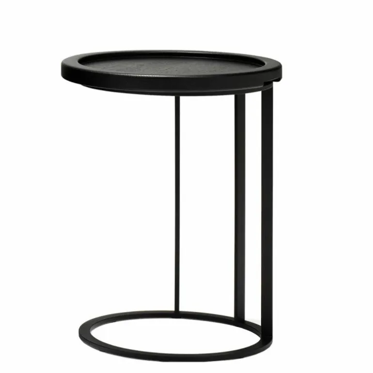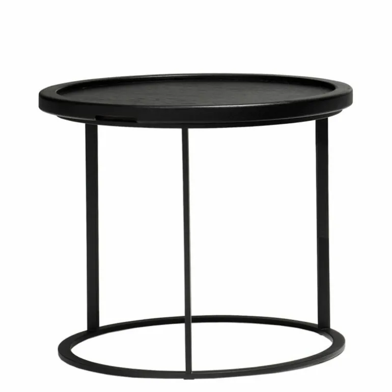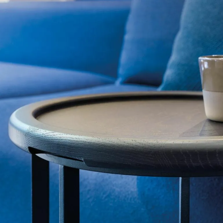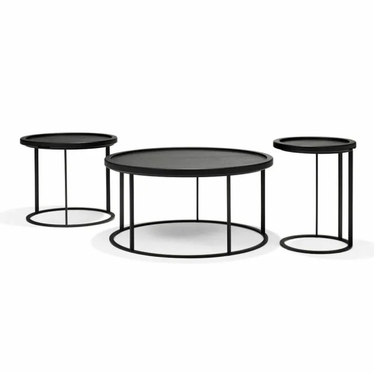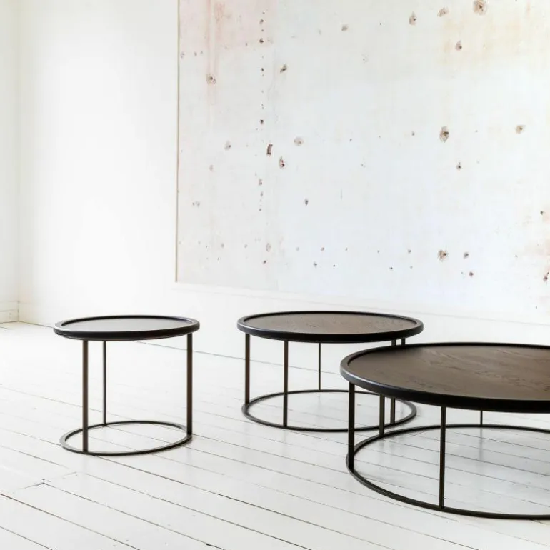 De kleinere twee varianten zijn voorzien van een los tafelblad dat daardoor ook als dienblad kan dienen. Aan de onderzijde zijn de bladen conisch gefreesd waardoor ze perfect in het stalen frame passen en de bladen zijn voorzien van subtiele handgrepen om het blad gemakkelijk uit het frame op te kunnen tillen. De kleinste, hoogste uitvoering kan bovendien gemakkelijk bij een bank aangeschoven door de praktische plaatsing van de poten. r