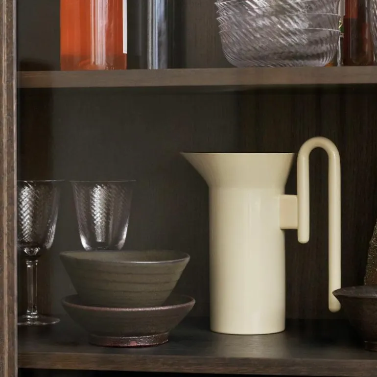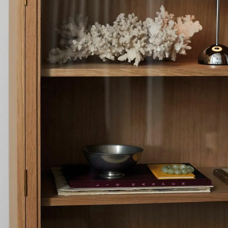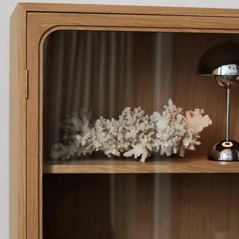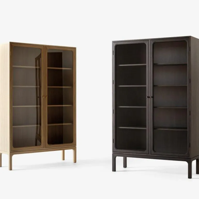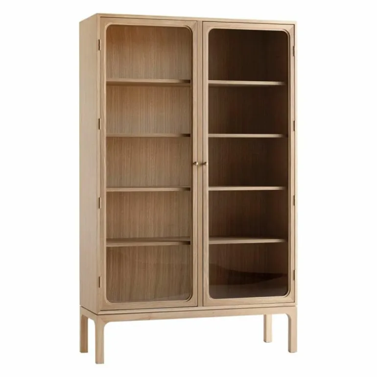 De kast is voorzien van maar liefst acht legplanken waardoor hij alle ruimte heeft om te zorgen voor een opgeruimd interieur. Met zijn elegant gebogen frame van hout en de transparante, glazen deuren biedt de kast mogelijkheden om sentimentele stukken tentoon te stellen. De royale kast wordt gedragen door vier ranke poten waardoor een open ruimte aan de onderzijde ontstaat. In combinatie met de glazen kastdeuren laat dit het ontwerp, ondanks het massieve karakter van hout, toch luchtig ogen.r