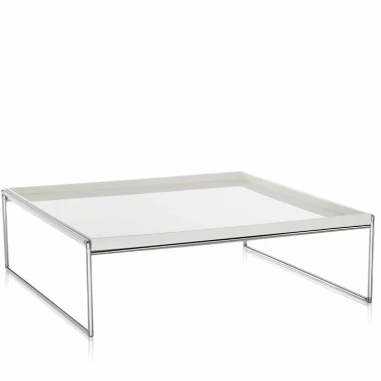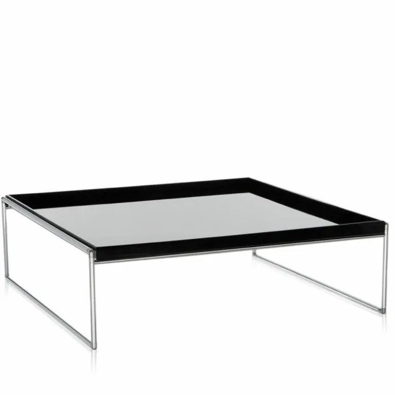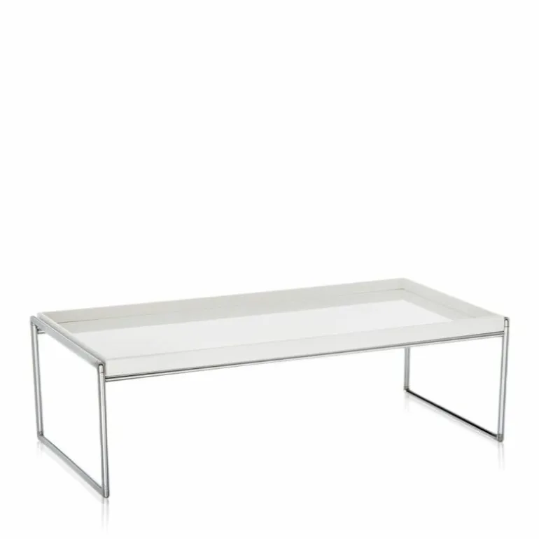 De Trays Tafel van Piero Lissoni voor Kartell is een systeem dat onderverdeeld is in tafelbladen voor thuis of op kantoor. Het constructieve idee van het design is de declinatie van tafeltjes en systemen van legplanken waarvan de bladen in hun design en afwerking doen denken aan gelakte Japanse dienbladen. r