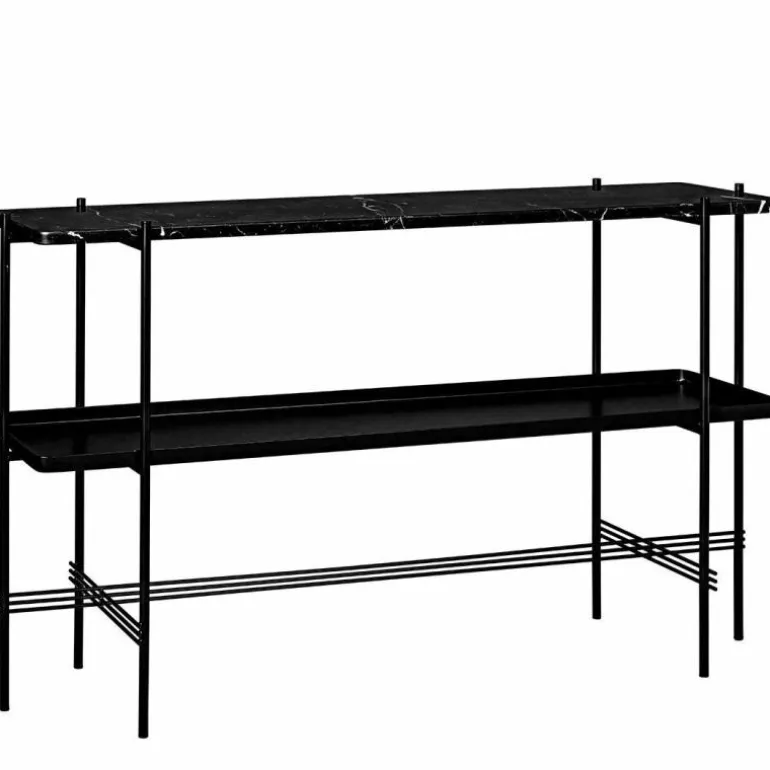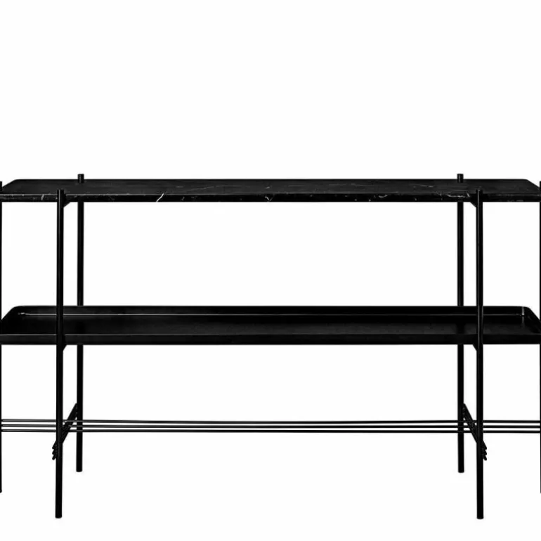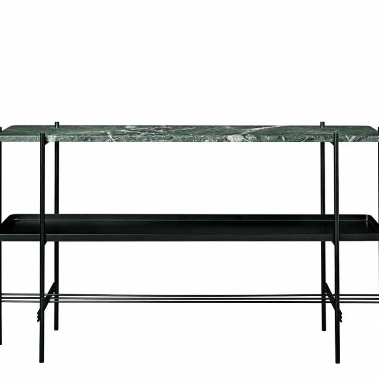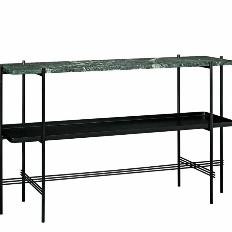 De TS Console Tafel 2 Tops van GamFratesi is voorzien van een messing of een zwart metalen frame en twee marmeren bladen. De breedte van de tafel bedraagt 120 centimeter, de diepte is 30 centimeter en de hoogte bedraagt 72 centimeter. Voor de marmeren bladen heeft u de keuze uit zwart, groen, wit of bruin.r