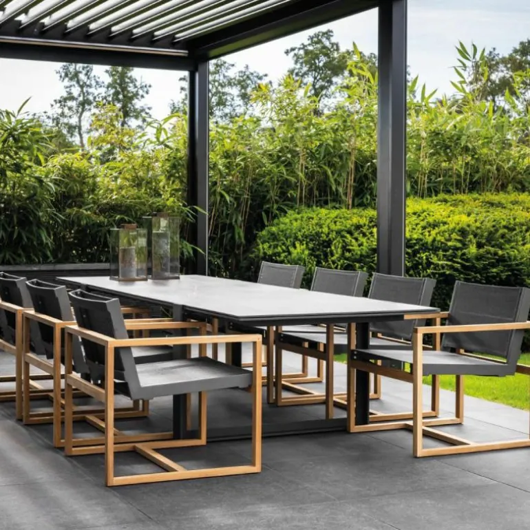 Het gehele frame van de fauteuil is vervaardigd uit duurzaam teakhout dat na verloop van tijd op natuurlijke wijze zal vergrijzen. De zitting van de fauteuil, dat in het frame lijkt te zweven, is voorzien van een Batyline stoffering in de kleur Shadow. Door het gebruik van deze materialen is de Urbino Fauteuil uiterst geschikt voor buitengebruik. Tevens is Batyline zo ontworpen dat het geen vocht absorbeert wat maakt dat de Urbino Fauteuil snel droogt en vlek bestendig is.r