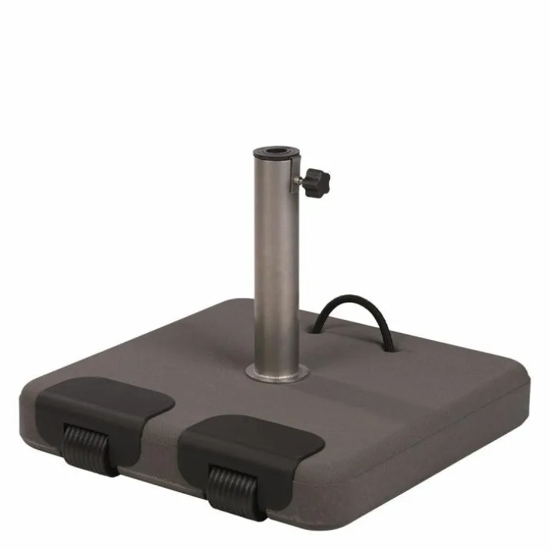 De Borek Verrijdbare Betonvoet is gemaakt van beton en beschikt over een RVS buis waarin de parasolstok gestoken kan worden. Door middel van de draaiknop aan de buis kan deze stok stevig vastgezet worden zodat uw parasol veilig blijft staan. Om de betonvoet gemakkelijk te kunnen verplaatsen, is hij aan één zijde voorzien van twee wieltjes en aan de andere zijde van een handgreep. Met zijn 45 kilo is de betonvoet te gebruiken bij ronde stokparasols met een diameter tussen 300 en 350 centimeter of vierkante stokparasols van 300 bij 300 centimeter met een stokdikte tussen 2,5 en 5,5 centimeter. Let op, het kiezen van de juiste parasolvoet is afhankelijk van drie dingen: de afmetingen van de parasoldoek, de diameter van de stok en de plek waar de parasol komt te staan. Komt hij op een beschutte plek met weinig wind te staan? Of woont u bijvoorbeeld dichtbij zee en heeft u vrijwel altijd wind? Als dit laatste het geval is, raden wij aan om voor de zekerheid een zwaardere parasolvoet te kiezen.