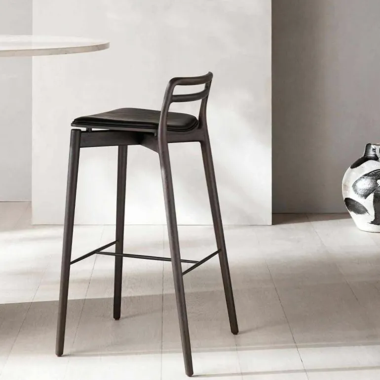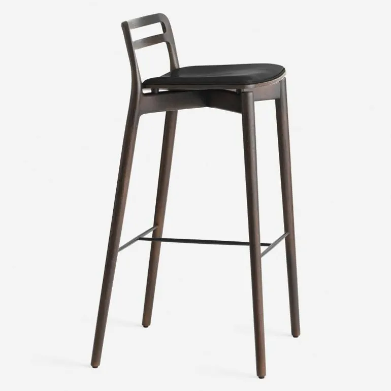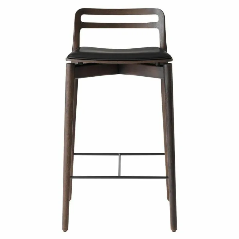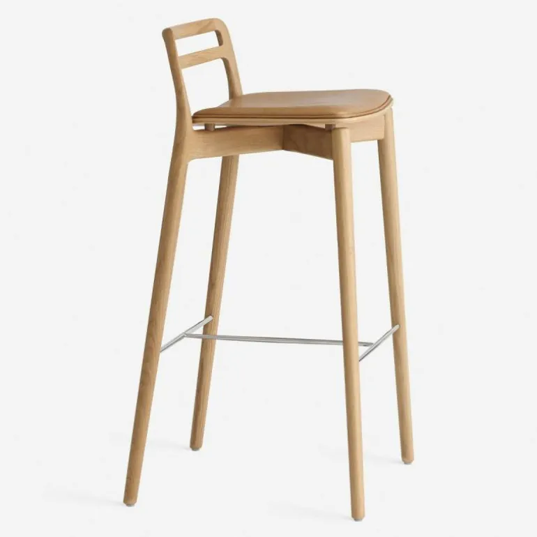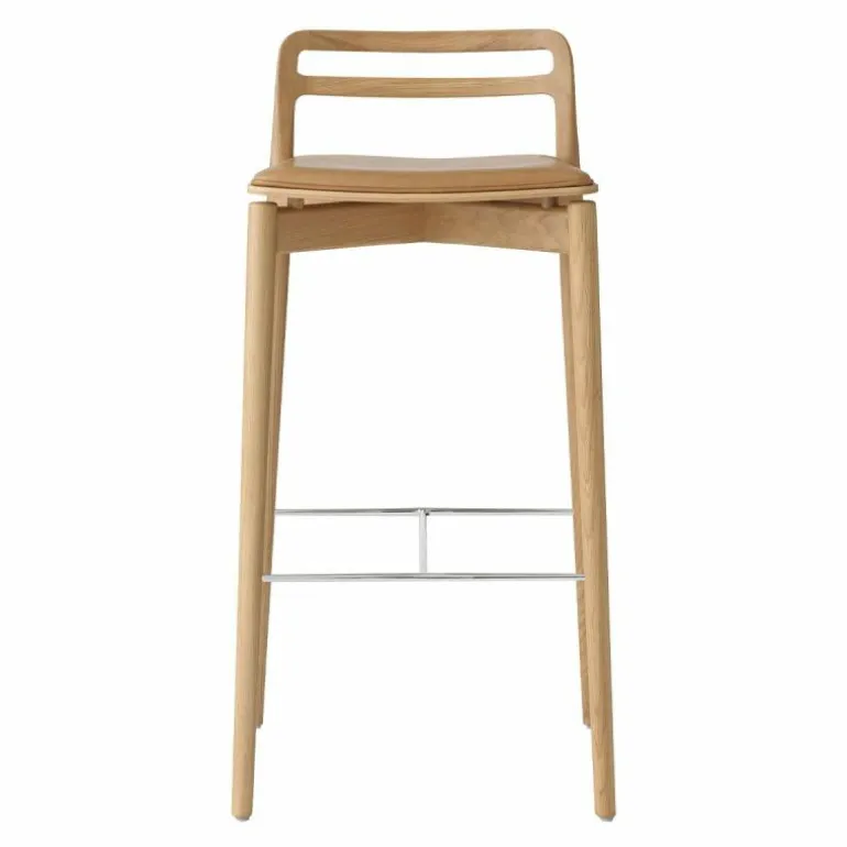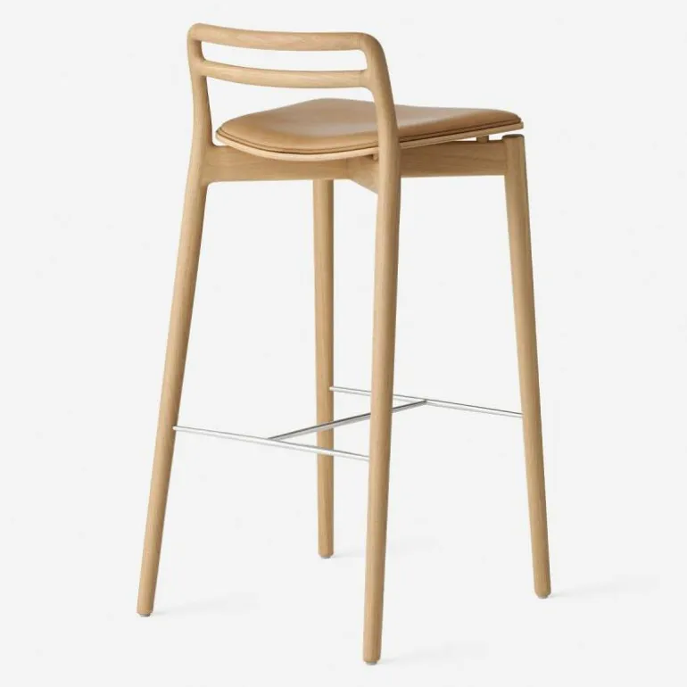 Het frame van de Cabin Barkruk is voorzien van mooie rondingen. De verbindingen van het massief eikenhouten frame zijn op een ingenieuze manier uit het zicht gehaald. Hierdoor lijkt het net alsof de rugleuning en de achterpoten uit één stuk hout zijn gesneden. De barkruk is verkrijgbaar in donker en licht eikenhout, dat is afgewerkt met een olie zodat het hout beschermd is tegen alledaags gebruik. Op het frame rust een slanke en sierlijke zitting van eikenfineer, die haast lijkt te zweven. De zitting is voorzien van een comfortabele aangehechte zachte lederen bekleding in de kleur zwart of sand. Het aniline leder is van hoge kwaliteit, dat mettertijd meer karakter zal krijgen. Het leder heeft een open porie structuur waardoor dagelijks gebruik het uiterlijk van het leder uniek zal maken. De voetensteun van staal zorgt voor stabiliteit in het frame en biedt de voeten een plek om te rusten. r