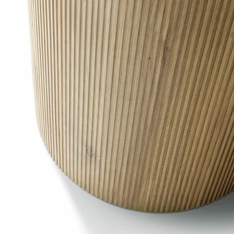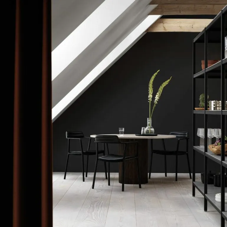 Deze ronde eettafel is een traktatie voor het oog. Het cilindervormige onderstel beschikt over een subtiel geribbeld houtwerk, dat naast een elegante uitstraling ook een aangename tactiele ervaring biedt. Deze is verkrijgbaar in licht of donker massief gelakt eikenhout. Met het tafelblad voegt Vipp een extra schepje luxe bij dit ontwerp, deze bestaat namelijk uit prachtig stevig marmer en is verkrijgbaar in zwart, grijs of licht ‘Jura’ marmer. Deze laatste marmersoort wordt dichtbij de beroemde Archaeopteryx steengroeven in Solnhofen, Duitsland gewonnen. Marmer is een natuurproduct en komt in allerlei samenstellingen, hierdoor is ieder tafelblad voorzien van zijn eigen expressie. r