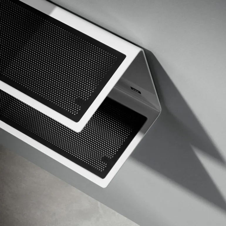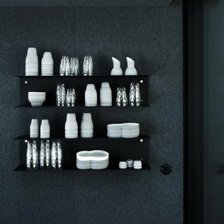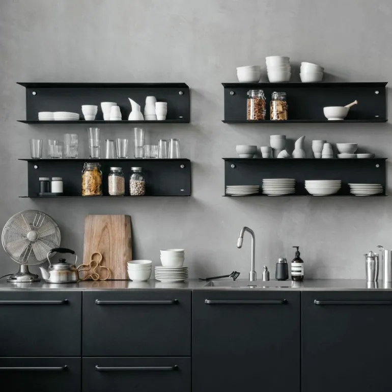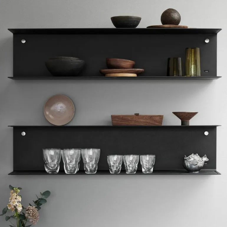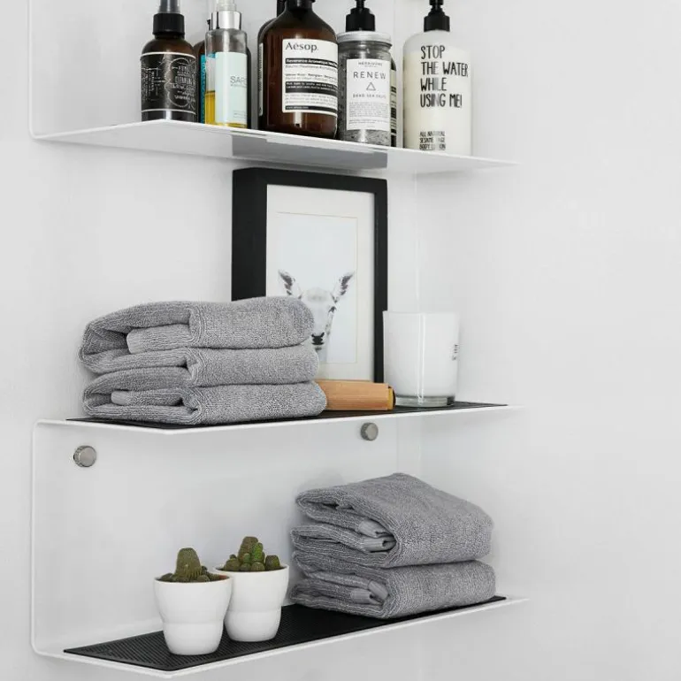 Zoals bijna alles uit de collectie, is ook deze wandplank gemaakt van gepoedercoat aluminium, in zwart of wit. Een mooi detail zijn de roestvaststalen schroeven in de twee bovenste hoeken van de plank. Op zowel de bovenste als onderste plank ligt een (los) siliconen matje, dat niet alleen een leuk onderdeel is van het design, maar ook beschermt tegen krassen.r