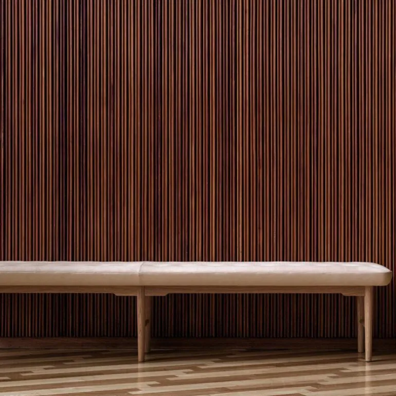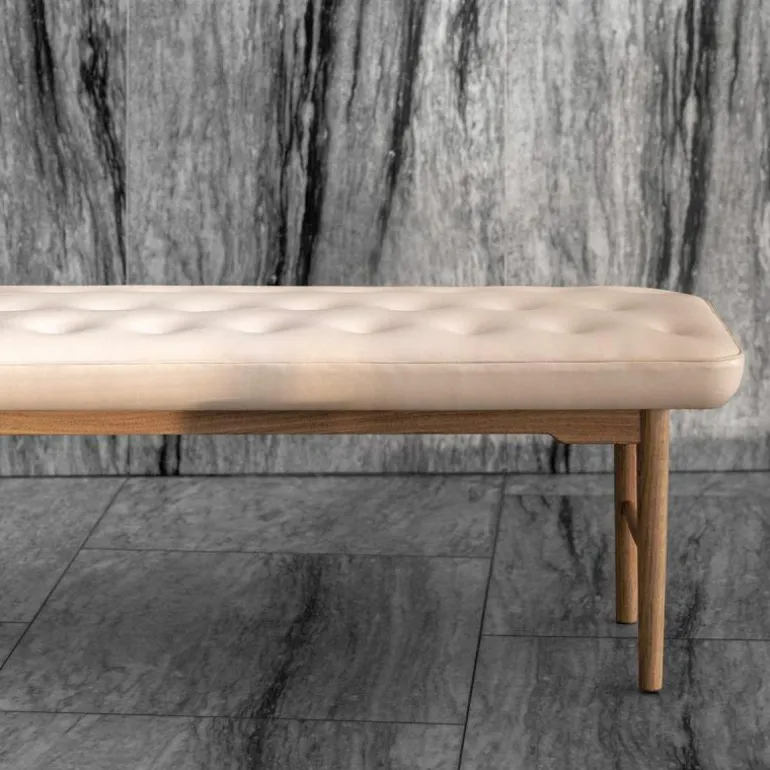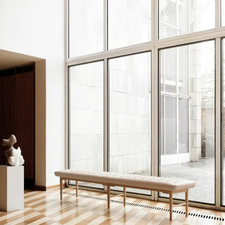 De VLA75 Foyer Bank bestaat uit een massief eikenhouten frame met een geoliede afwerking en draagt een comfortabel kussen. Het zitkussen is voorzien van handgemaakte knopen die het eenvoudige ontwerp voorzien van een luxe uitstraling. Wegens de vele bekledingsmogelijkheden heeft MisterDesign één uitvoering geselecteerd welke online direct verkrijgbaar is. Deze variant is zorgvuldig bekleed met Sif 90 leder.