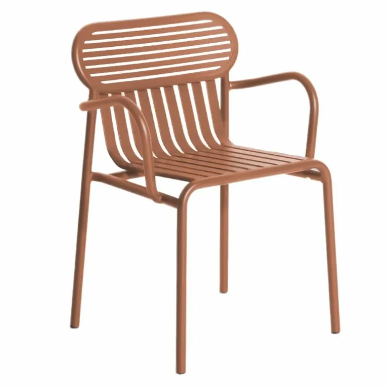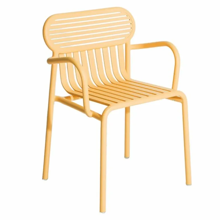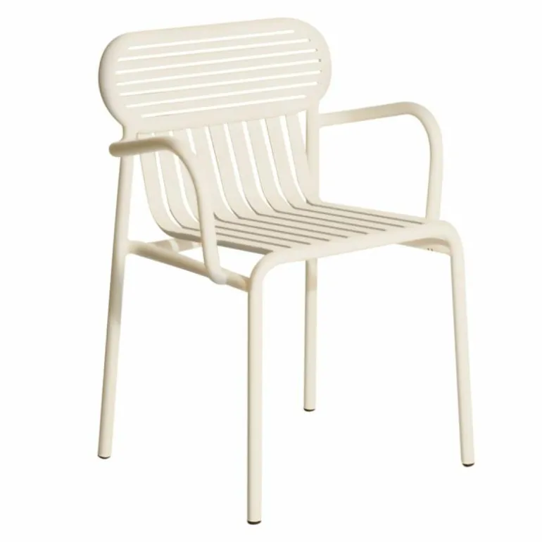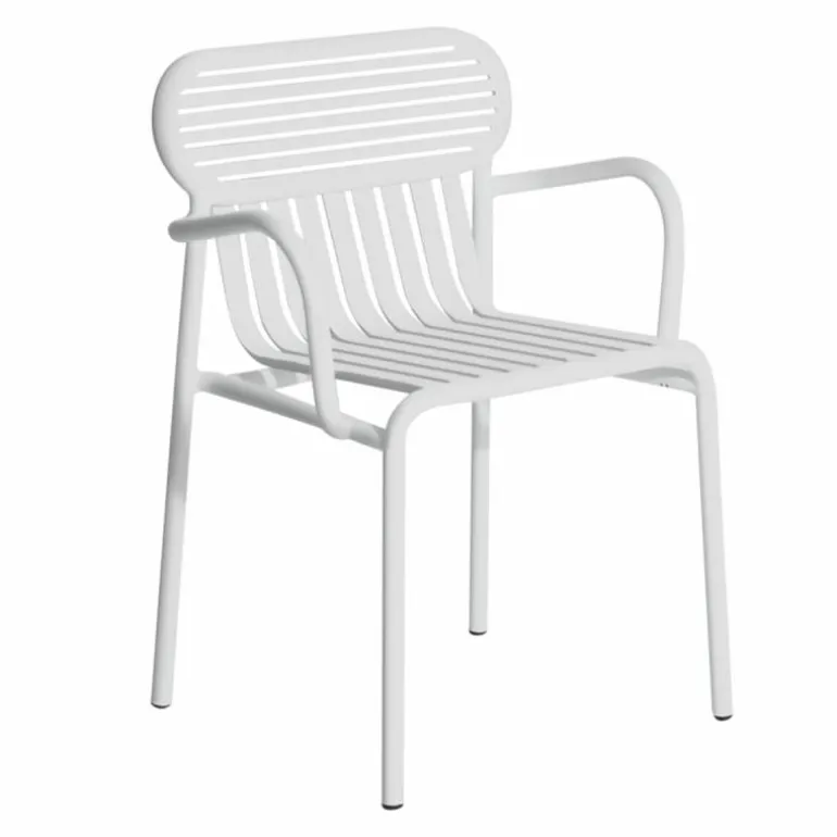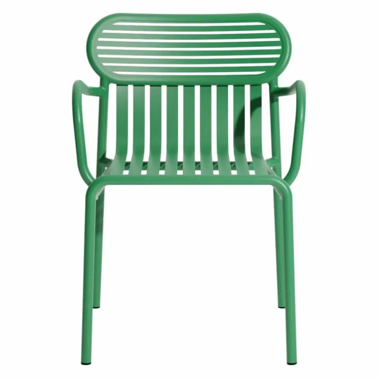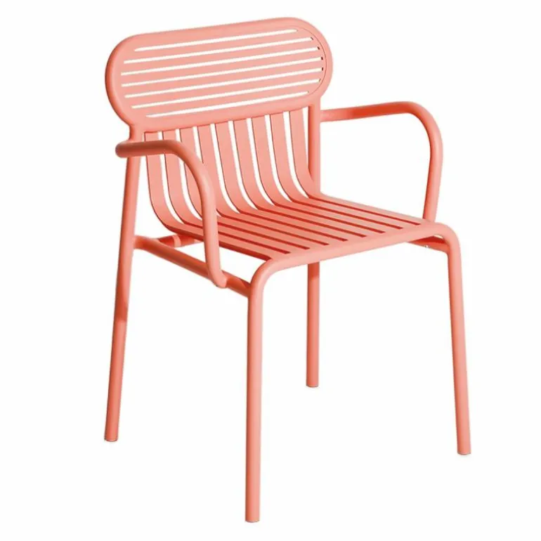 De Petite Friture Week-end Stoel Met Armleuning is een ontwerp van Studio BrichetZiegler. Deze stoel is onderdeel van de Week-end serie die bestaat uit verschillende tuinmeubelen verkrijgbaar in trendy kleurtjes. Alle meubelen zijn ontworpen met veel oog voor functionaliteit en materiaal. Zo is de stoel stapelbaar en hierdoor makkelijker op te bergen. Daarnaast is de stoel door het gekozen materiaal onderhoudsvriendelijk en lichtgewicht. De ronde vormen van de metalen stoel geven het design in combinatie met de horizontale en verticale lijnen een grafische look. Dankzij de variatie aan kleuren zal er voor iedere buitenruimte een geschikte variant tussen zitten!r