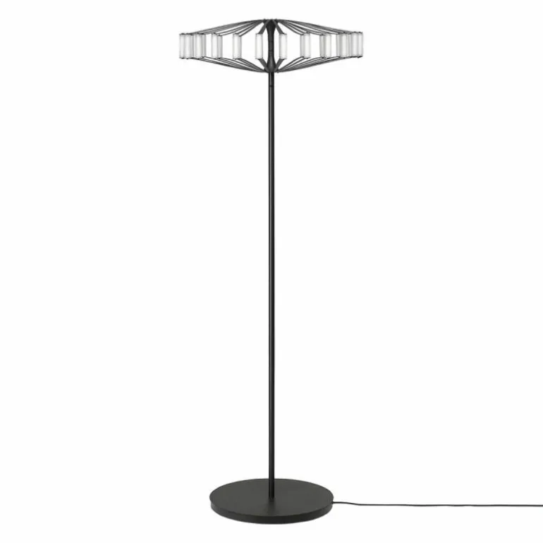 Net als de Wheel Hanglamp heeft de Wheel Vloerlamp de kenmerkende wielvorm. In het midden van de Wheel Vloerlamp is duidelijk de aluminium naafvorm van een fietswiel te herkennen. Vanuit dit punt vertrekken de metalen spaken en vormen zo een prachtig lijnenspel. Aan elk uiteinde van de spaken vormt een cilindervorm uit acrylaat een afzonderlijk lichtpunt van de hanglamp. Gezamenlijk vormen ze een cirkel van licht. De LED lichtpunten zijn zeer zuinig en duurzaam in gebruik. De voeding van de lichtbronnen gaat niet via draden, maar via het metalen frame van de Wheel Vloerlamp. Dit maakt de lamp minder kwetsbaar voor storing door het ontbreken van gevoelige connecties. Voor extra gebruiksgemak is het mogelijk om de LED lichtpunten te dimmen via de snoerdimmer. Zo vormt de Wheel Vloerlamp in elke situatie het perfecte lichtpunt in de ruimte. De metalen spaken zijn uitgevoerd in een mat zwarte poedercoating. Deze afwerking geeft de vloerlamp een zeer stijlvolle en stoere uitstraling. De ronde staander en lampvoet zijn in dezelfde afwerking uitgevoerd. De lampvoet en staander hebben een vrij klassieke vormgeving, waardoor alle aandacht naar de lampenkap uitgaat.r